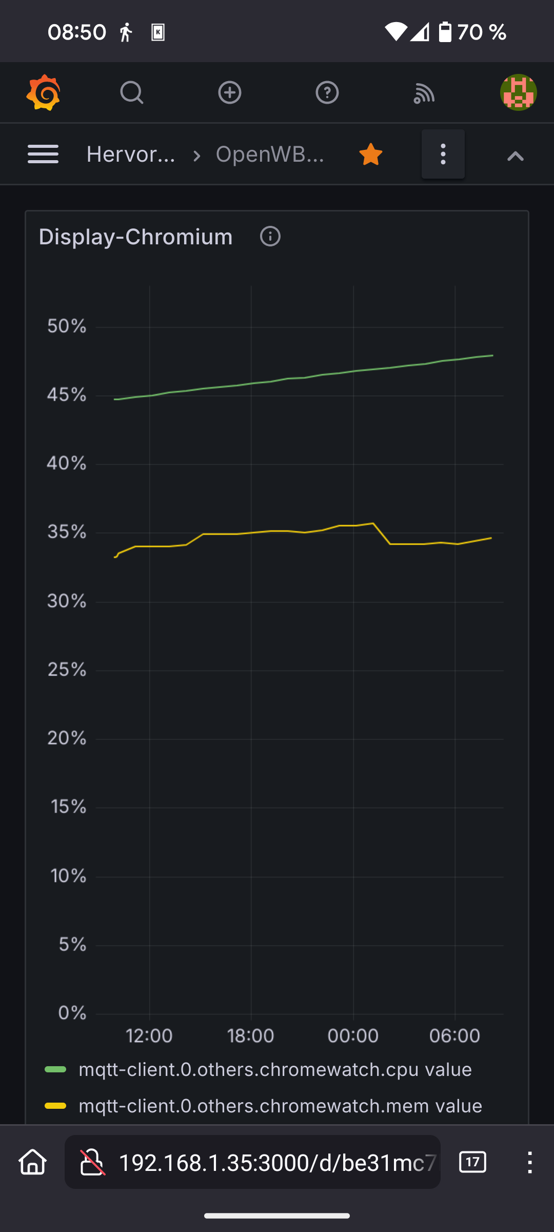 Neue Erkenntnis: Die Energieflußanzeige sorgt für erkennbar langsamere Zunahme der CPU-Nutzung. Hinsichtlich Speicherverbrauch bin ich mir nicht so sicher. Ich habe gestern abend das Wallbox-Display auf die Energieflußanzeige umgeschaltet: