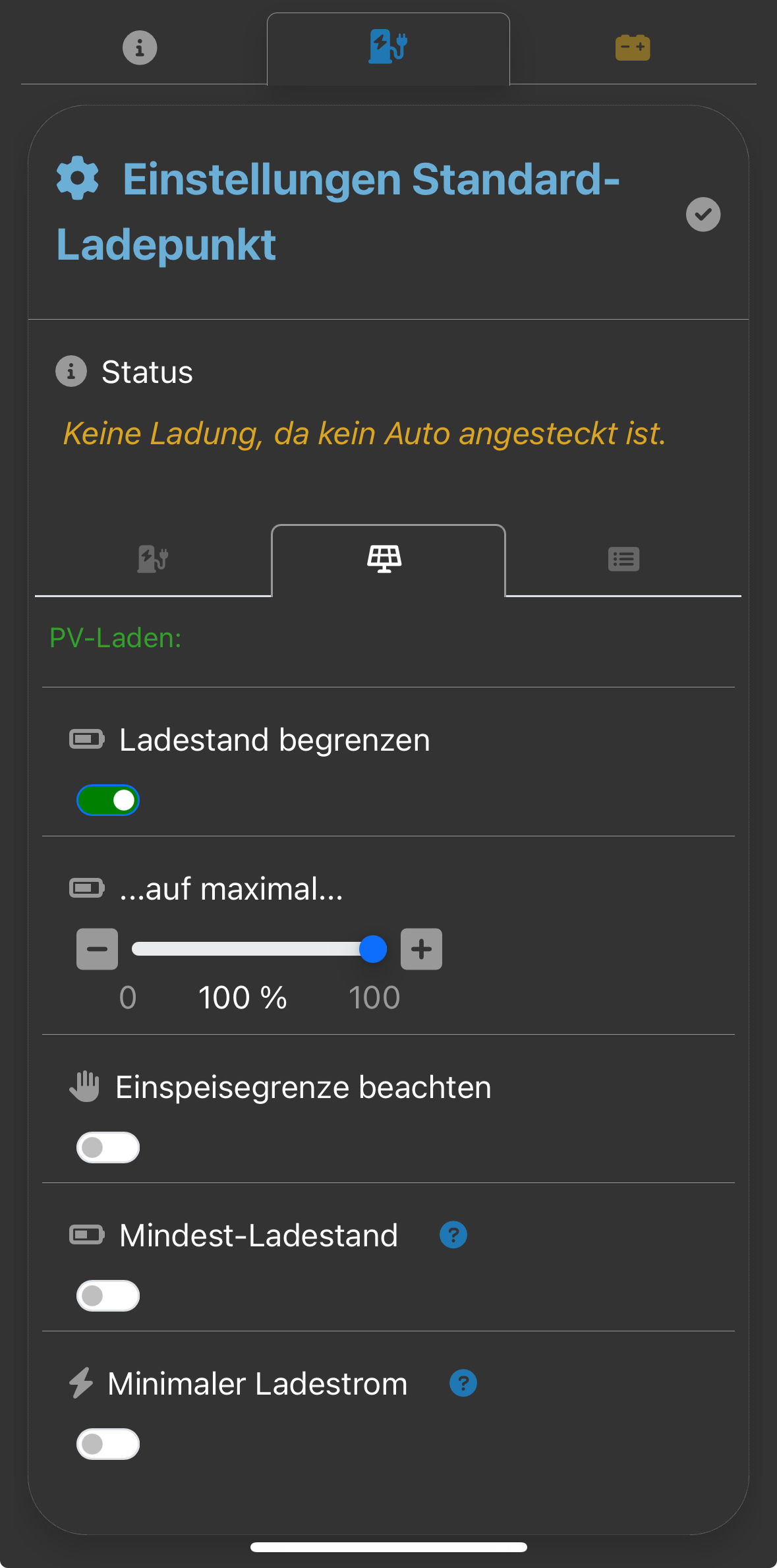 Ich denke du meinst folgendes siehe Bild, ist aber nicht aktiviert.Gero hat geschrieben: Mi Nov 27, 2024 7:59 pm Auf der Hauptseite, wenn Du die Details zum Ladepunkt aufklappst. Da gibt es einen Schieber "minimaler Dauerstrom". Du scheinst aber Colors statt des normalen Cards zu nehmen. Da weiß ich nicht, wo man das einstellen kann.