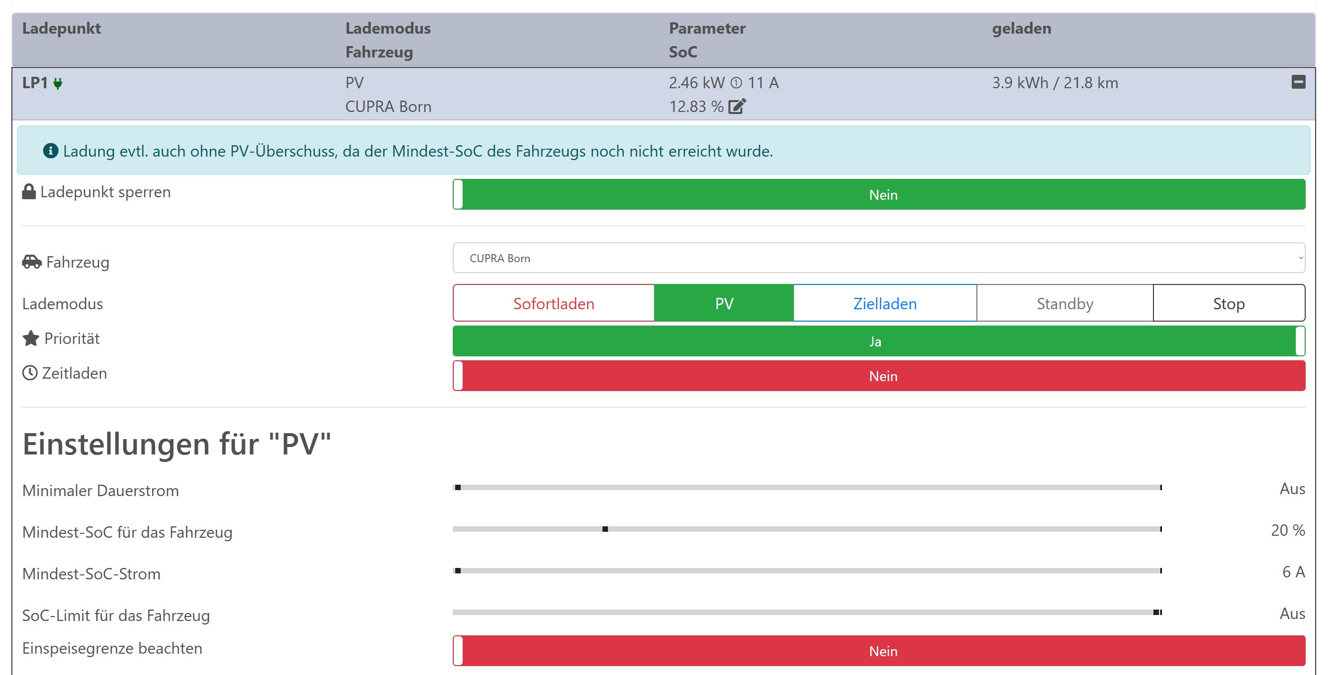 Es wird im PV Modus dreiphasig geladen obwohl der Überschuss nur für einphasig ausreichen würde. Hab' schon über mehrere Minuten Netzbezug. LP sperren & entsperren hat das Problem nicht behoben.