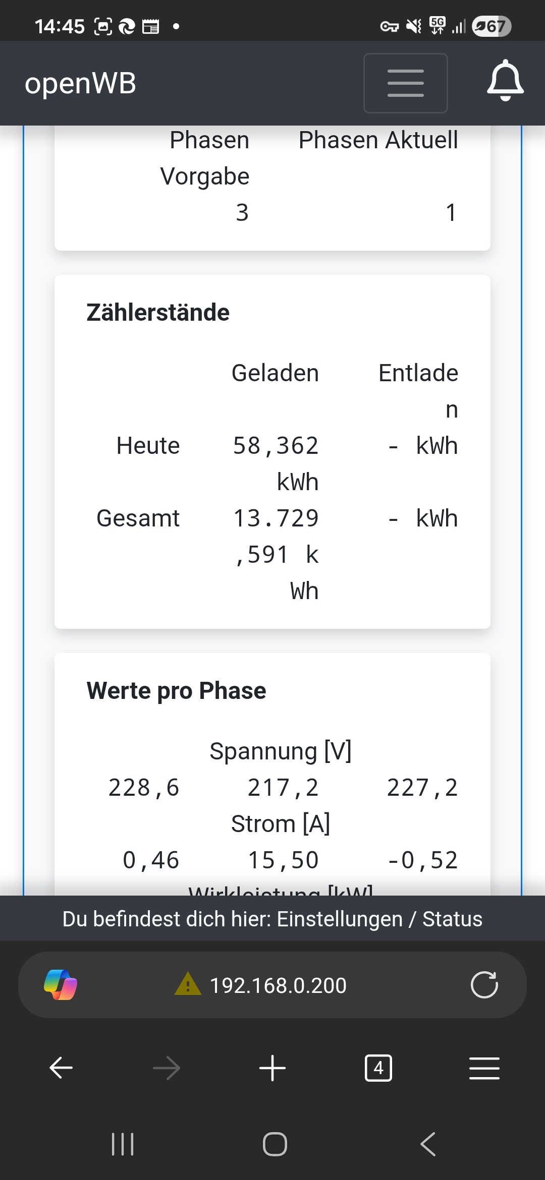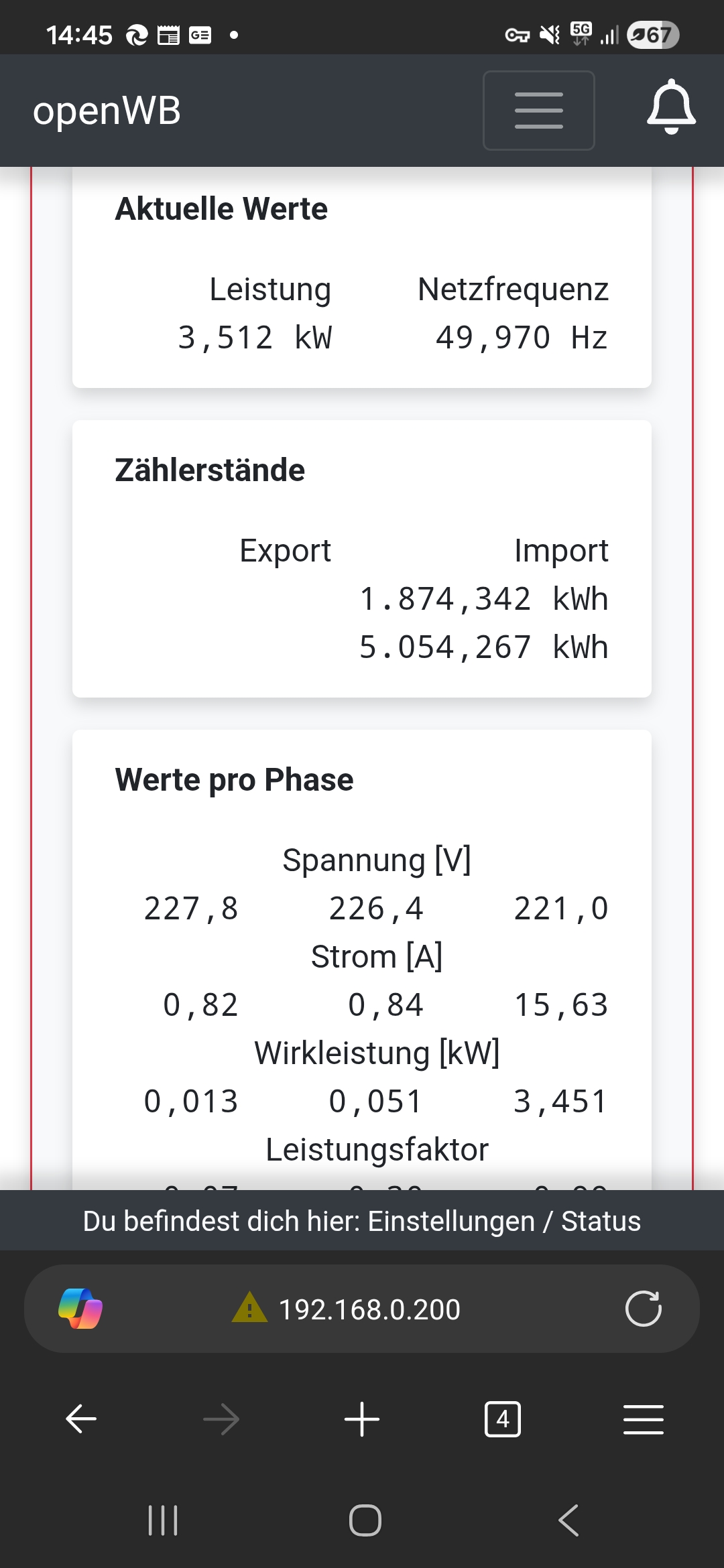 Spannend, man sieht auch bei Dir am openWB-Zähler, daß zwar nur einphasig auf Phase 1 mit 16A geladen wird, aber Phase 2 ebenfalls etwas anzeigt (0,06A). Sehe ich hier auch. Daß die Netzfrequenzmessung zu niedrige Werte anzeigt ist da fast schon nebensächlich.