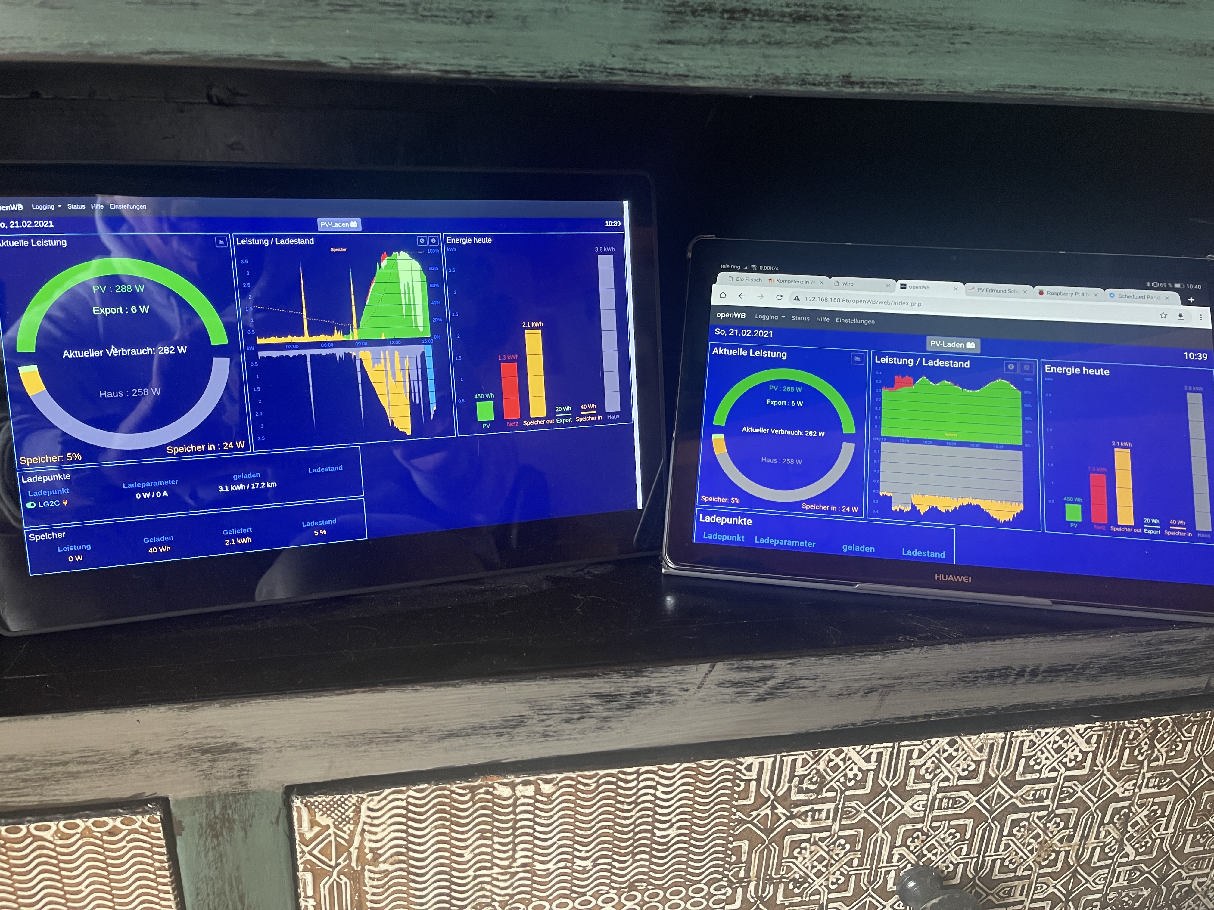 Links am Foto das Display mit der dauerhaften Anzeige der Website über einen Raspberry Pi, rechts eine aktuelle Anzeige auf dem Tablet.