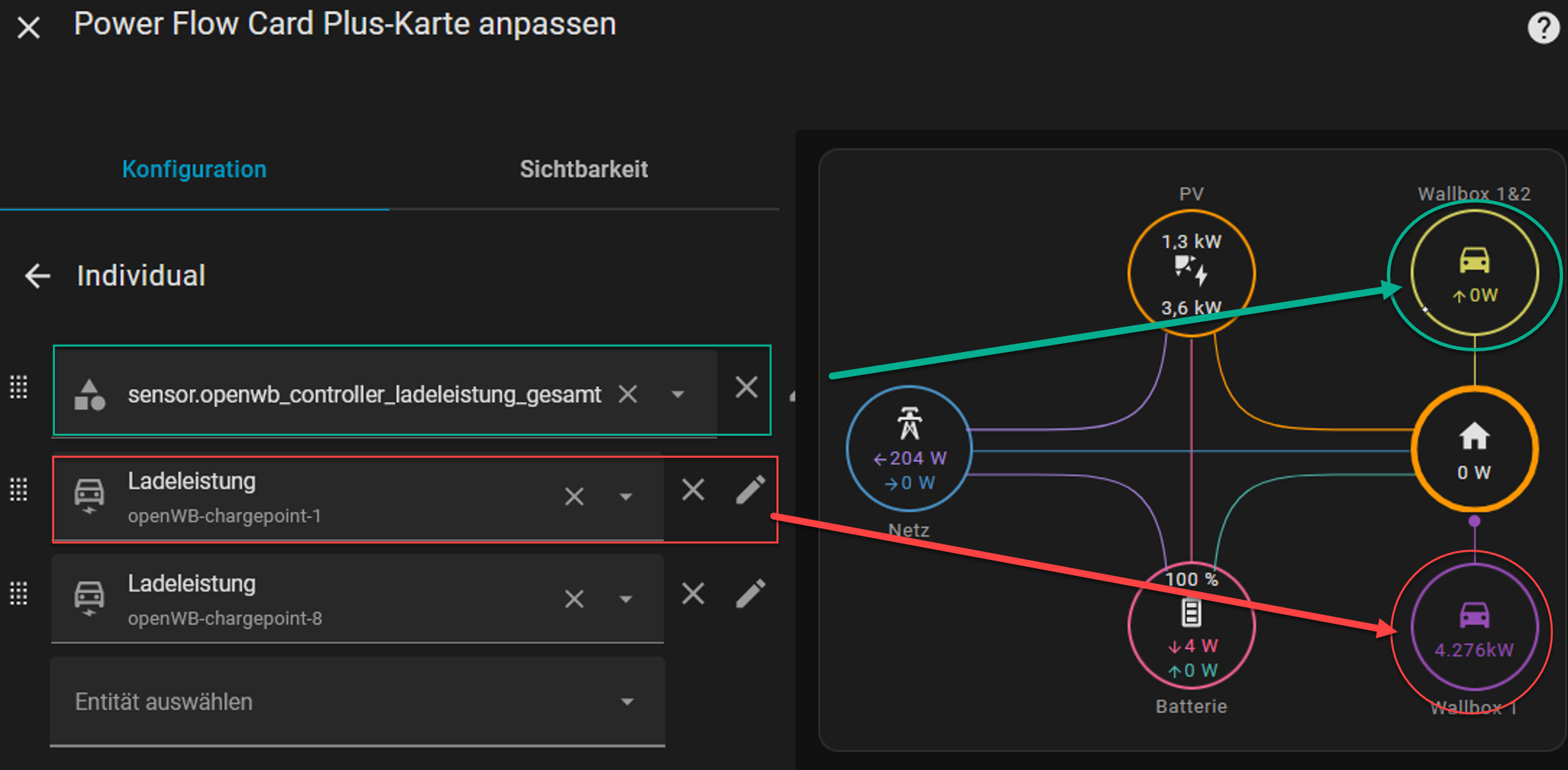 ja das geht: wobei hier der Sensor Ladeleistung gesamt bei mir zur Zeit nicht funktioniertRobeck hat geschrieben: Fr Nov 14, 2025 4:34 pm Sooo mir raucht jetzt der Kopf. Habe als absoluter Anfänger HA installiert, alle meine Geräte inkl OpenWB (momentan nur Anzeigen der Werte), sind implementiert.