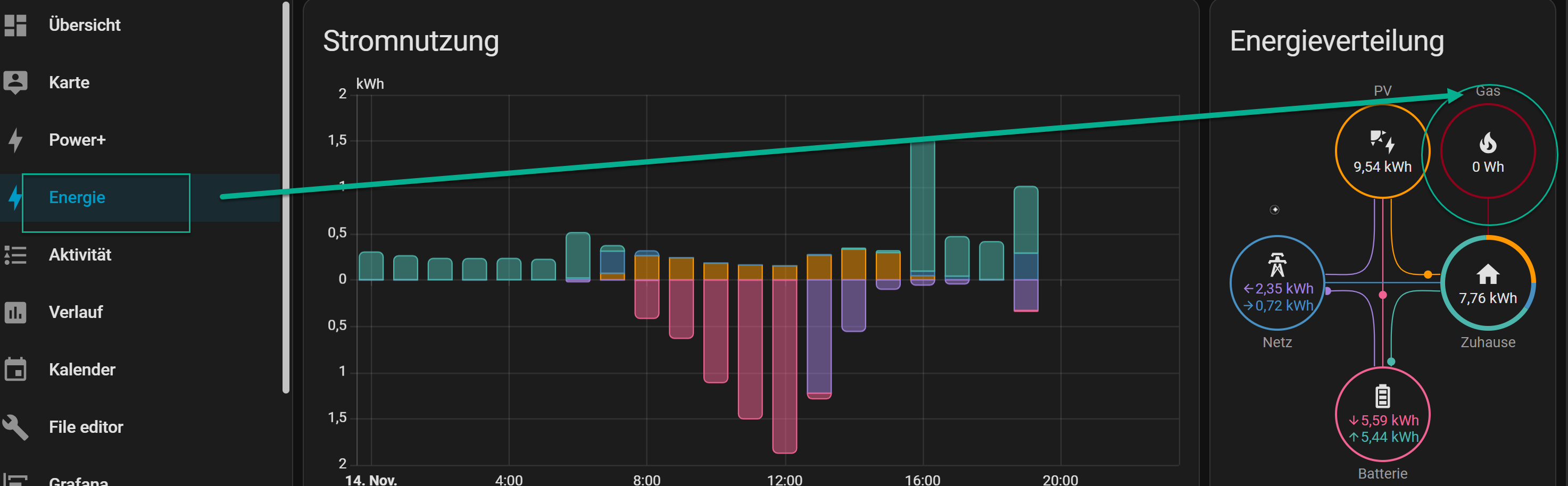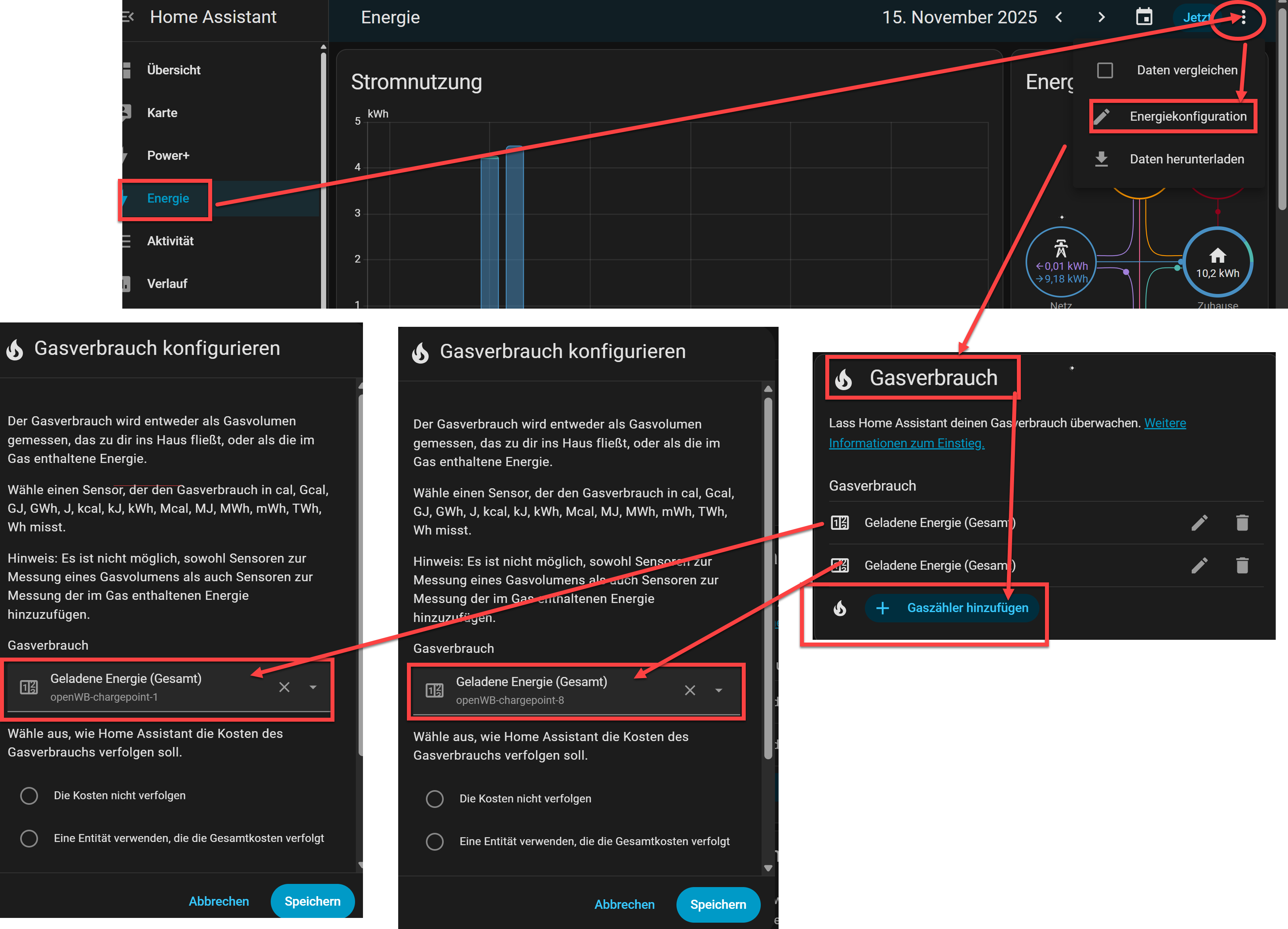 Im EnergieDashboard mit zwei Ladepunkten so: Habe das als Gasverbraucher angelegt, anders wüsste ich nicht wie.Robeck hat geschrieben: Fr Nov 14, 2025 9:15 pm Okay, danke. Ich kapier trotzdem nicht wie/was du da gemacht hast????