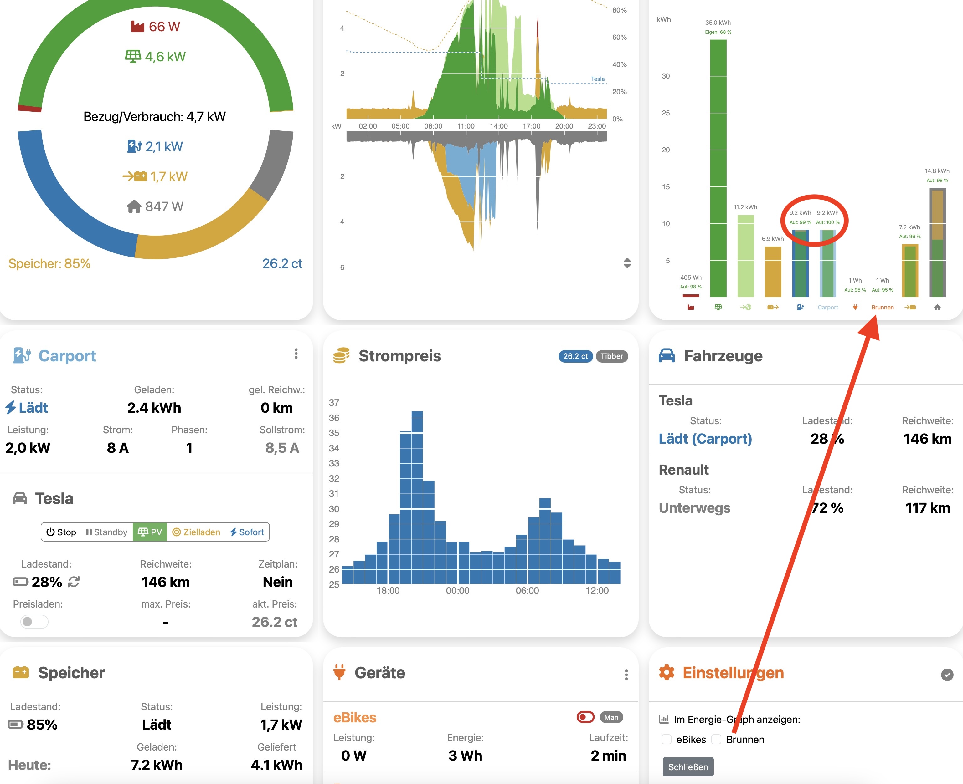 Danke für die Hinweise. Das Ausblenden von Ladepunkt und Devices funktioniert tatsächlich derzeit nur beim Tagesgraphen für den aktuellen Tag. In den anderen Modi muss es wieder aktiviert werden.