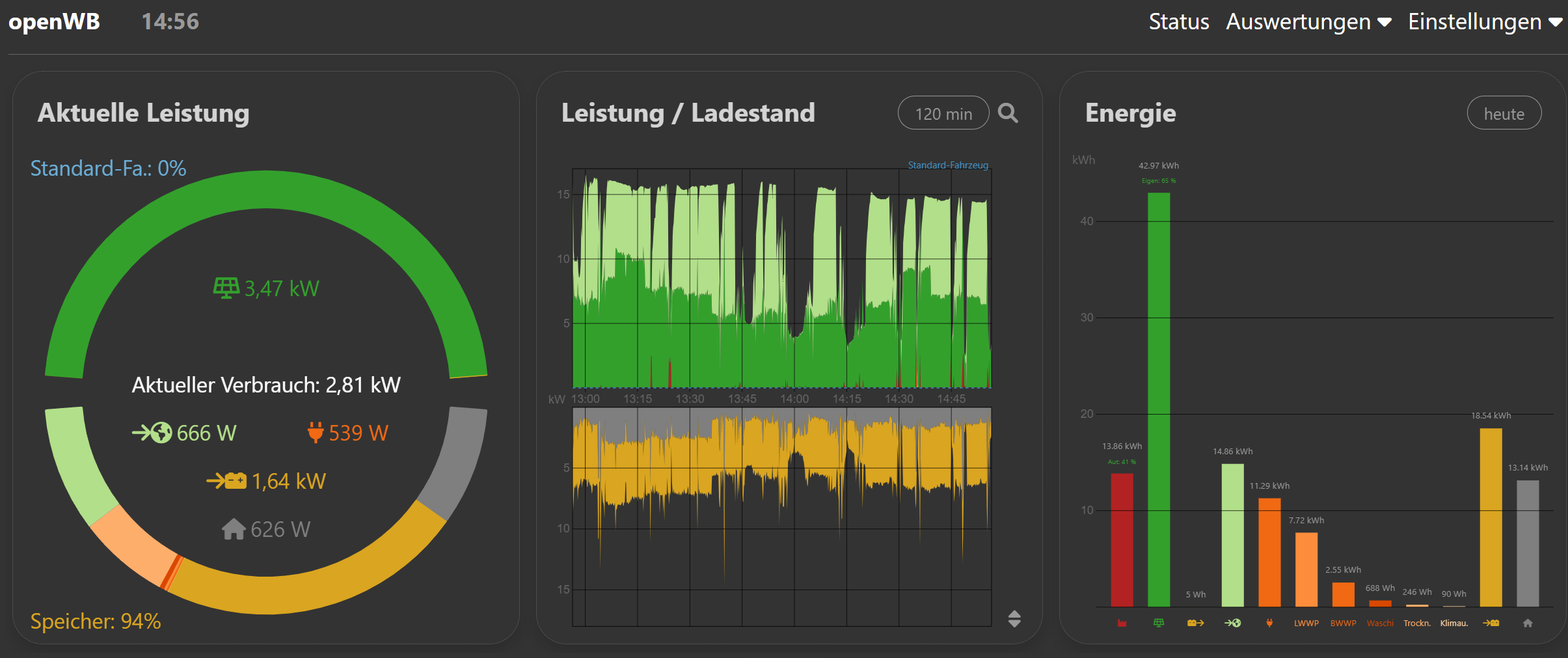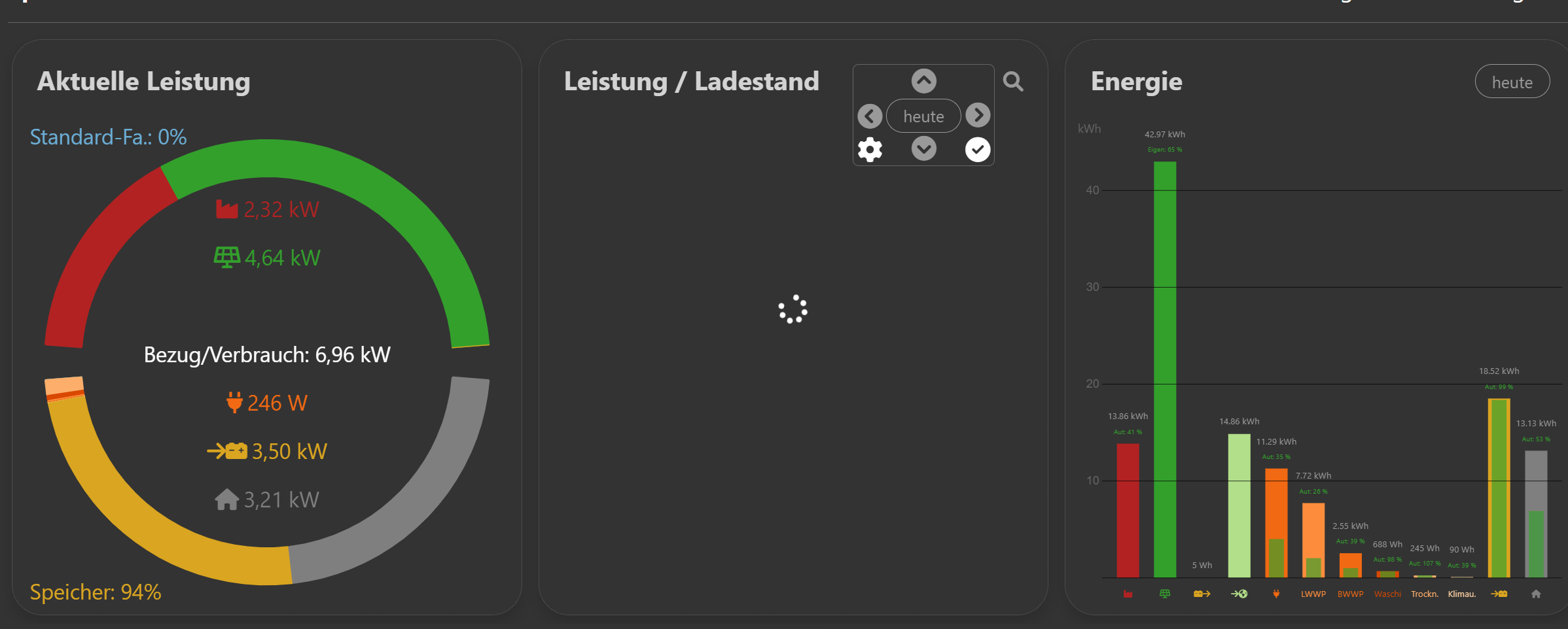 Mit 1.9 funktionierte das wunderbar. Seit 2.x lädt bei mir der mittlere Graph nicht mehr bzw. braucht sehr sehr lange (ca. 2min). Ich hatte das schon mal angeschnitten und es ist gewissermaßen bekannt, da man am iPad jedoch keine Konsolenfehler im Browser einsehen kann, ist die Ursache wohl nicht ganz klar. Beobachtet habe ich auch, dass nach dem aufwachen des iPads der mittlere Graph geladen wird, wenn man am iPhone die OpenWB aufruft. Ganz so als ob die Abfrage am iPad nach dem aufwachen nicht initiiert wird…