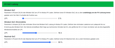 an LP2 hängt ein Ampera, für diesen ist kein SoC konfiguriert (lässt sich meines Wissens nach nur umständlich über OBD auslesen, lädt in Abwesenheit einer SoC Einstellung und bei genügend PV Strom immer voll und gibt dann Ruhe - so wie es sein soll)