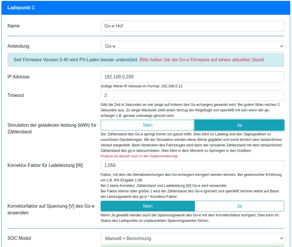 Bei Faktor kleiner oder größer 1 wird der Zählerstand des Go-e ignoriert und openWB rechnet selbst auf Basis der Leistungswerte des go-e * Korrektur-Faktor.
