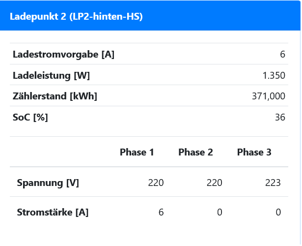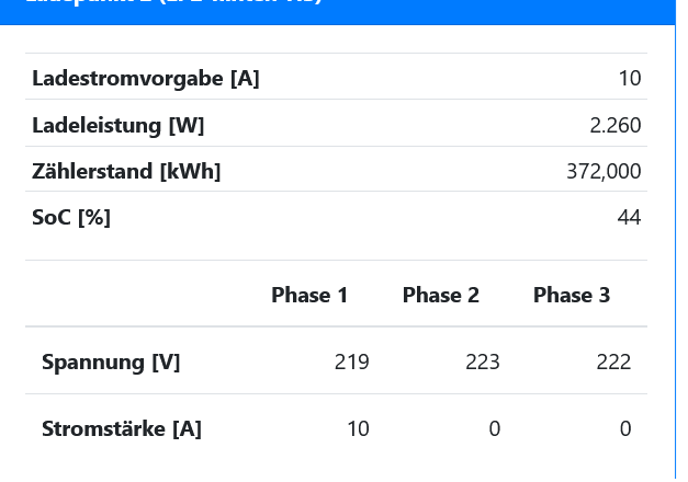 Das ist klar. Aber der Spannungswert unter Status Ladepunkt und ich frage mich immer noch, ob der nicht relevant ist, wenn die openWB entscheiden muss, ob sie noch ein Ampere freigeben kann :roll: . Woher weiß die Software sonst, wieviel Überschuss vorhanden sein muss, um 1A freigeben zu können?