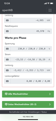 Aventinus hat geschrieben: Mo Feb 27, 2023 10:35 am 1. Die Batterieleistung des SH10RT wird ohne Vorzeichen auf dem Modbus bereitgestellt. Ich vermute, das wird so in der OpenWB übernommen. Somit wird sowohl Ladung als auch Entladung als Ladung im Graph und in der Anzeige dargestellt.