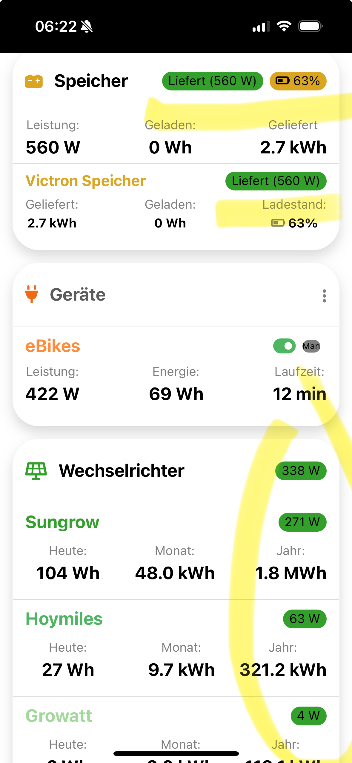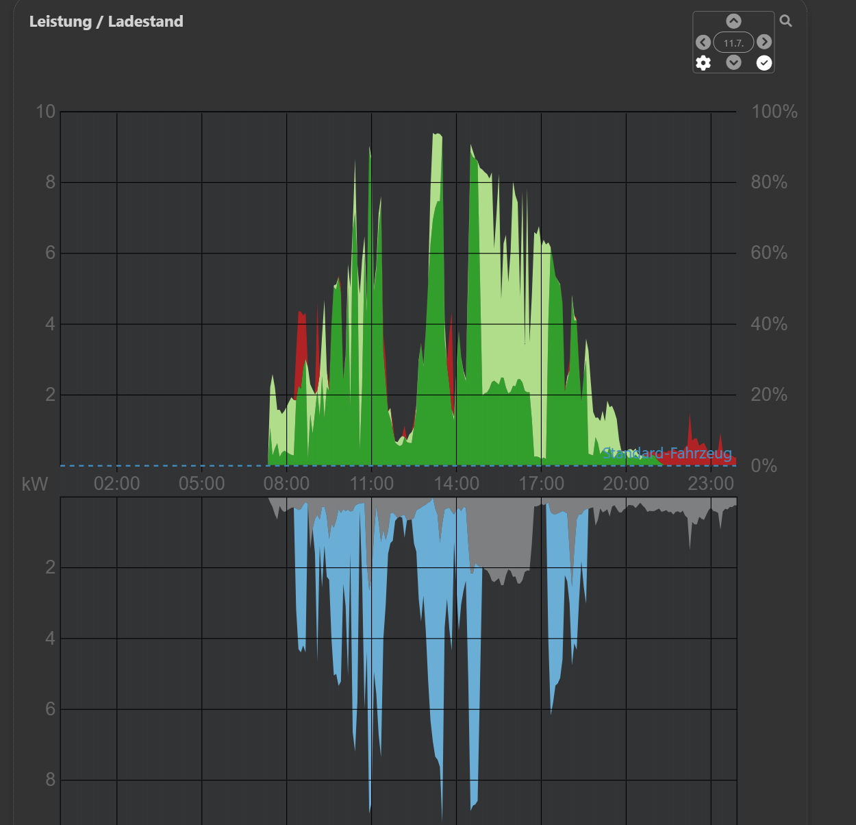 Frage 3: Die Farbzuweisung im Color-Theme finde ich etwas verwirrend. Bei "Aktuelle Leistung" und "Energie" ist das hellgrün das was ins Netz gespeist wird. Bei den zeitlichen Graphen "Leistung / Ladestand" ist die gleiche Farbe das was die PV-Anlage liefert !?