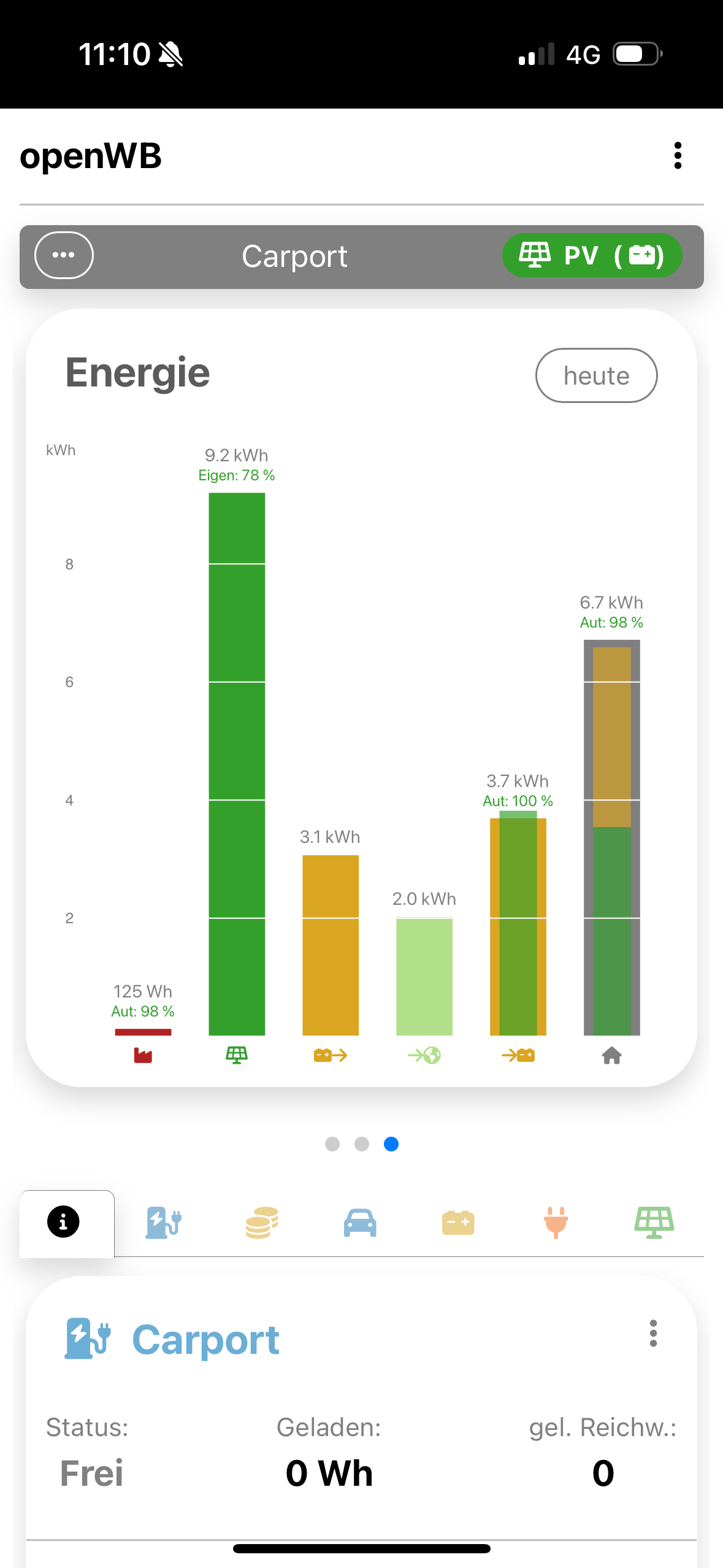 Kleine Unschönheit: beim Tages-Graphen und der Tagesstatistik wechselt der Text des Button ständig zwischen "heute" und "lädt" (obwohl kein Auto angesteckt ist...).