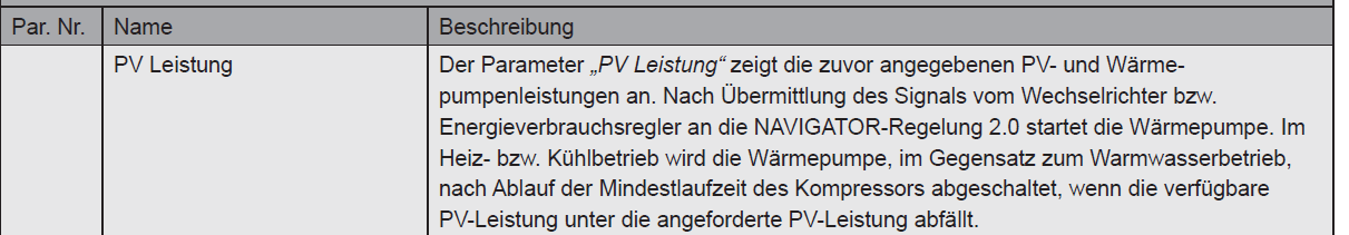 Eventuell könnte es auch helfen, alle Infos aus oWB an die WP zu übertragen, also auch PV-Leistung, Batterieleistung und Hausverbrauch. Dazu habe ich den angehängten Ausschnitt in der Technischen Unterlage "Photovolktaik Strom-Nutzung" von IDM gefunden.
