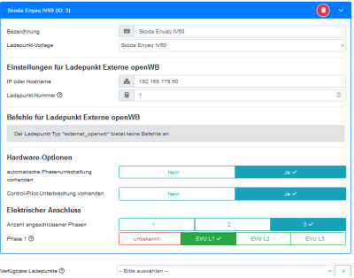 2023-02-28 15:40:30,780 - {control.chargepoint:867} - {INFO:MainThread} - LP 3, EV: Skoda Enyaq IV60 (EV-Nr.1): Theoretisch benötigter Strom 6A, Lademodus pv_charging, Submodus: Chargemode.PV_CHARGING, Phasen: 1, Priorität: True, max. Ist-Strom: 15.66