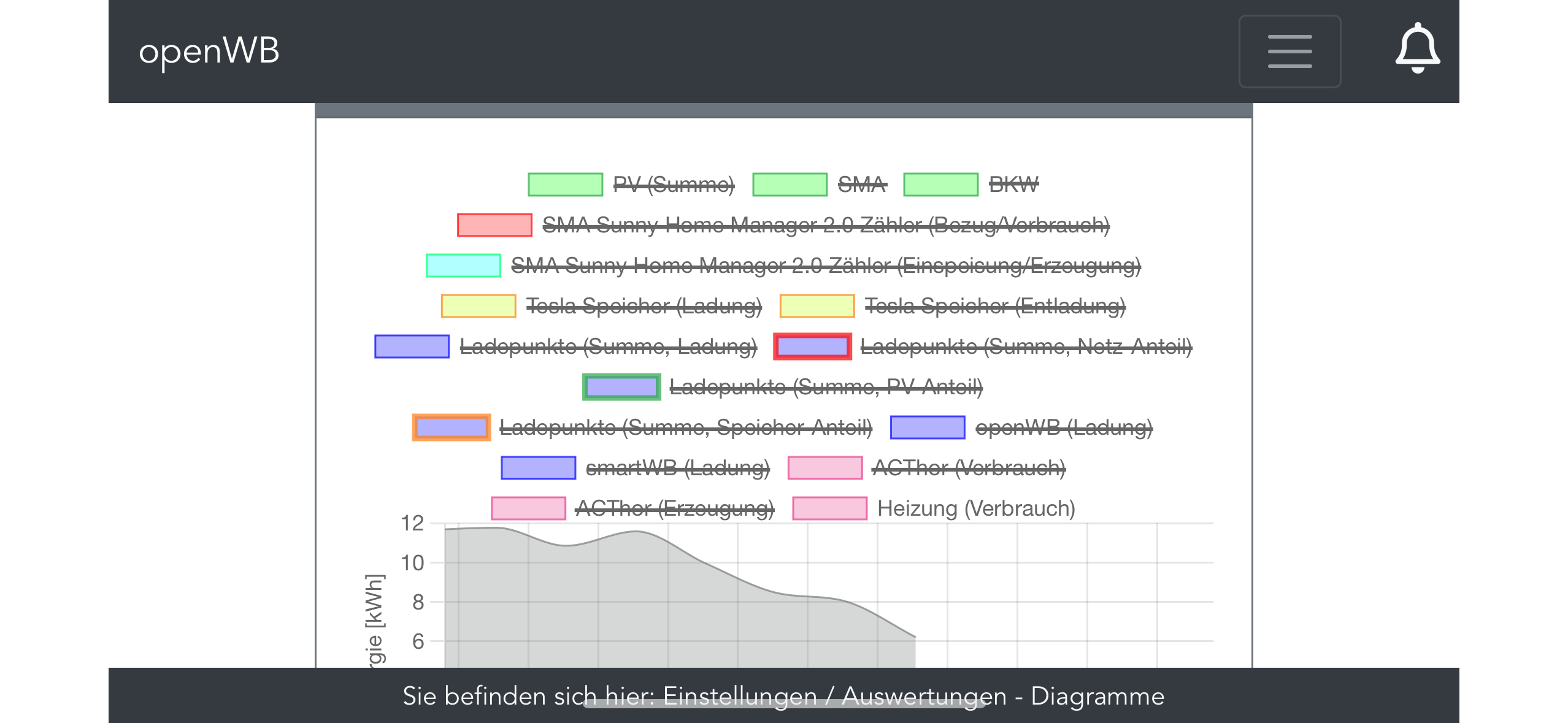 Hallo, habe bei mir schon länger das Problem, dass ich bei meinem Smartphone nicht alle Möglichkeiten in der Grafiklegende sehe und somit auch nicht alle bzw. alle bis auf einen abwählen kann. Irgendwie wird hier das Anzeigefenster begrenzt. Im Screenshot kann ich z.B. den Hausverbrauch nicht abwählen.