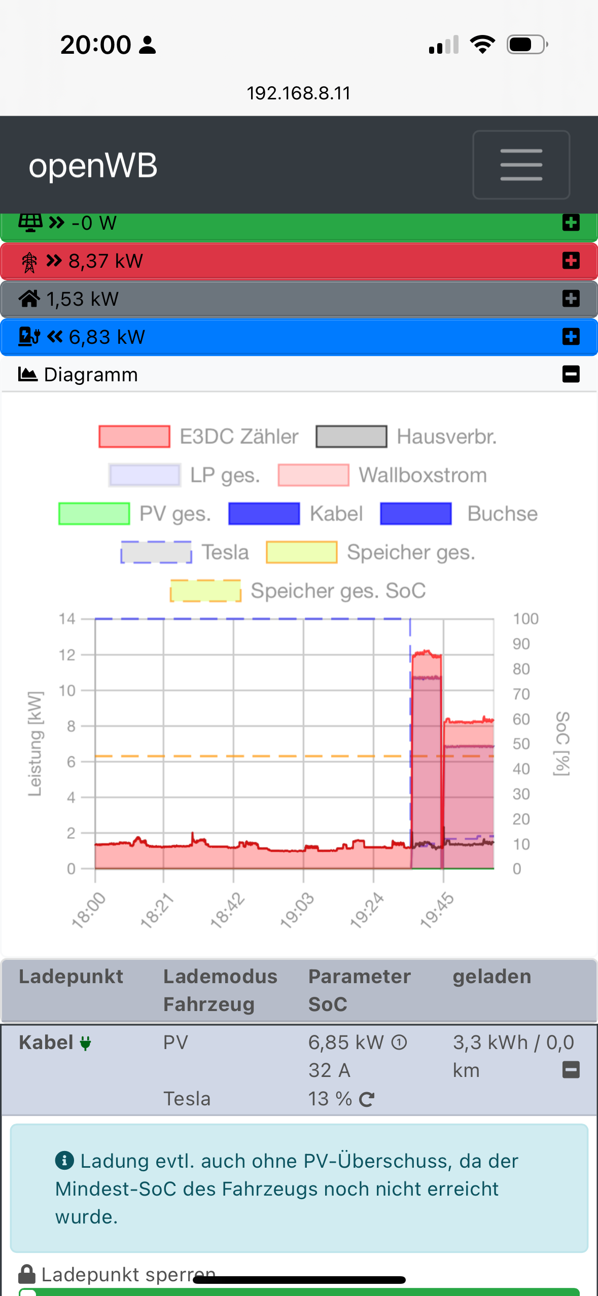 Mindest-SoC heißt nicht, dass dieser so schnell wie möglich erreicht werden soll. Bei mir reicht, wenn der irgendwann früh erreicht wird (gemütlich mit 1p). Dafür gibt es auch den extra Stromslider. -> Für das Thema am besten einen eigenen thread aufmachen.Gero hat geschrieben: Mo Dez 16, 2024 8:17 am Das grundlegende Problem liegt meiner Meinung nach tiefer: Denn durch die Ladung auf Mindest-SoC sollte ja eigentlich per Sofortladen geschehen, also Fahrzeug möglichst schnell auf SoC bringen. So erwarte ich es, zumindest wenn keine Sonne mehr da ist.