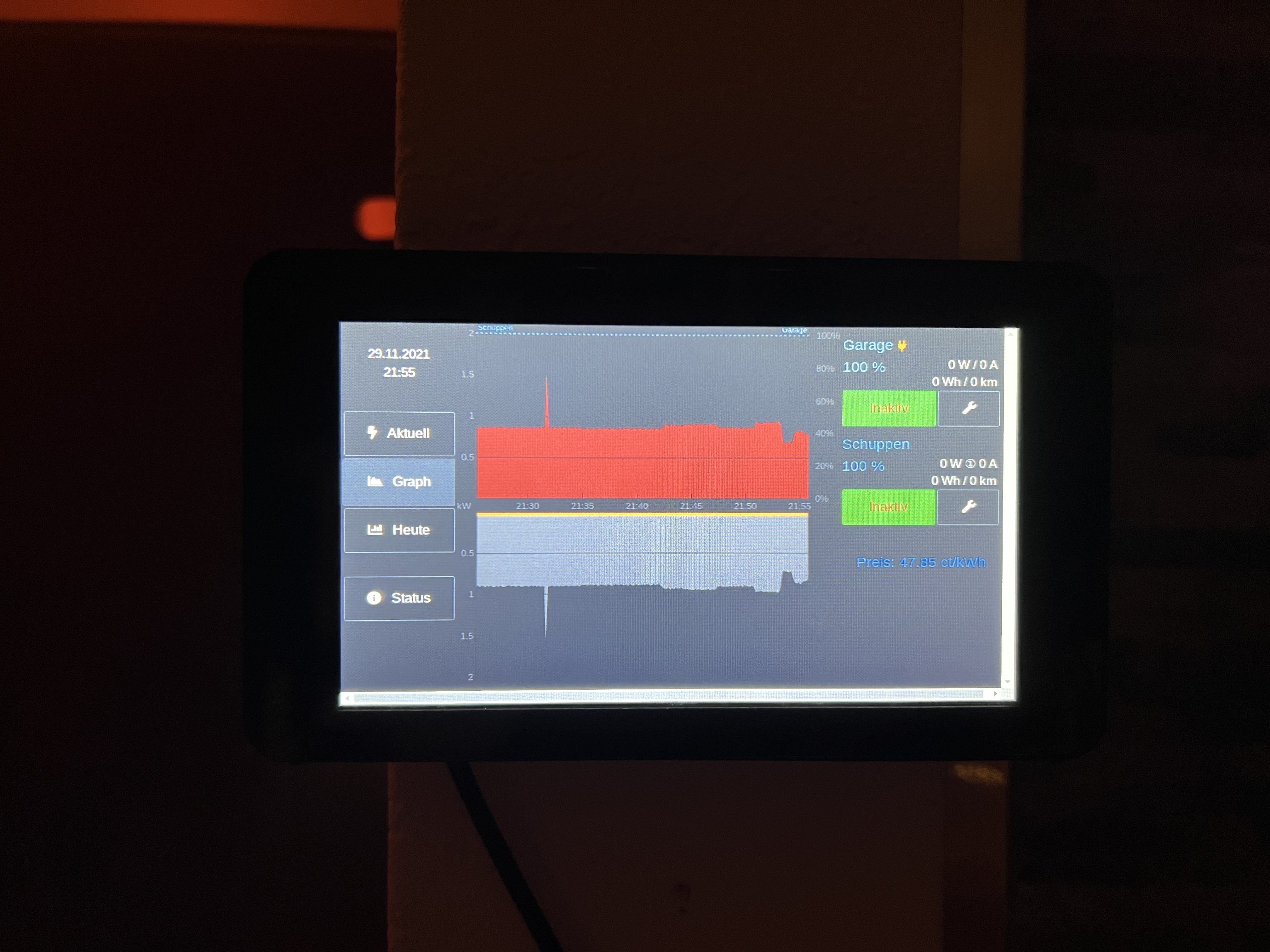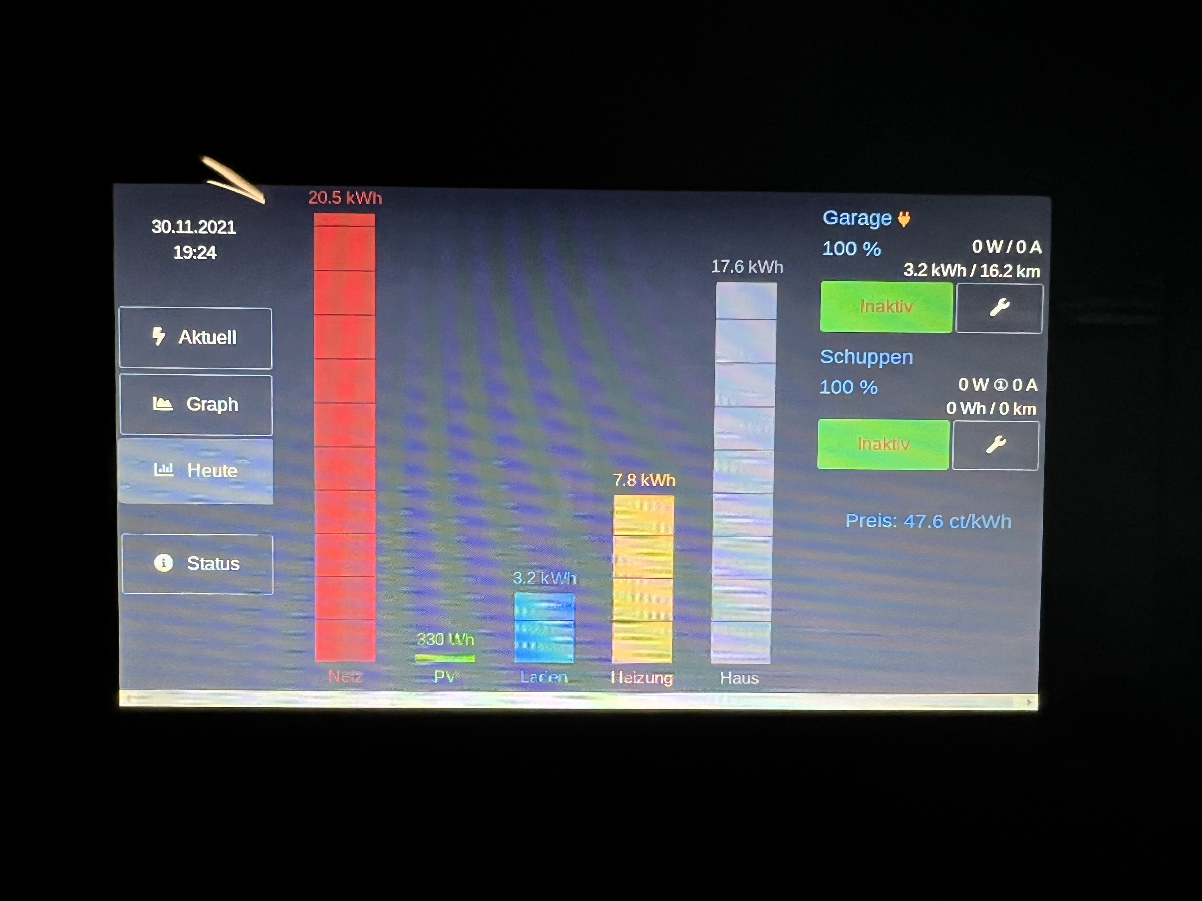 Das ist auch so gedacht. "Aktuell", "Heute" und "Graph" haben jeweils die gleiche Breite, die Buttonleiste links und die Leiste mit den Ladepunkten rechts bleiben immer stehen. "Heute" und "Graph" sollten aber jeweils vollständig sein, oder fehlt etwas?
