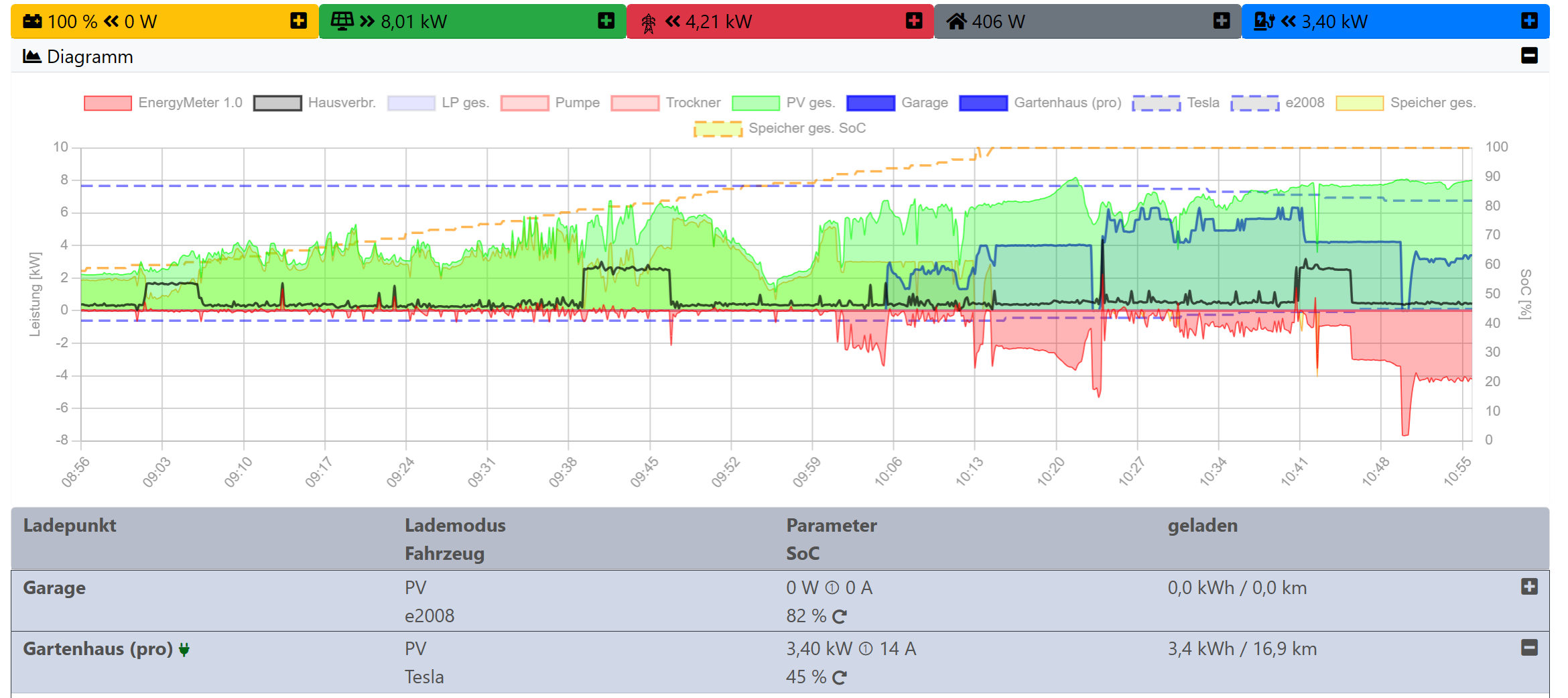 Ladevorgang hat schön geregelt, als der Speicher voll war wurde der meiste Überschuss ins Auto geladen. Um 10.37 gab's dann einen Verbraucher im Haus, Ladeleistung wurde reduziert, später wurde (unnötigerweise) von 3p auf 1p umgeschaltet, seither dümpelt die Regelung irgendwo im einphasigen Bereich rum. Erst jetzt wo ich schreibe wurde der 1p/3p Timer neu gestartet.