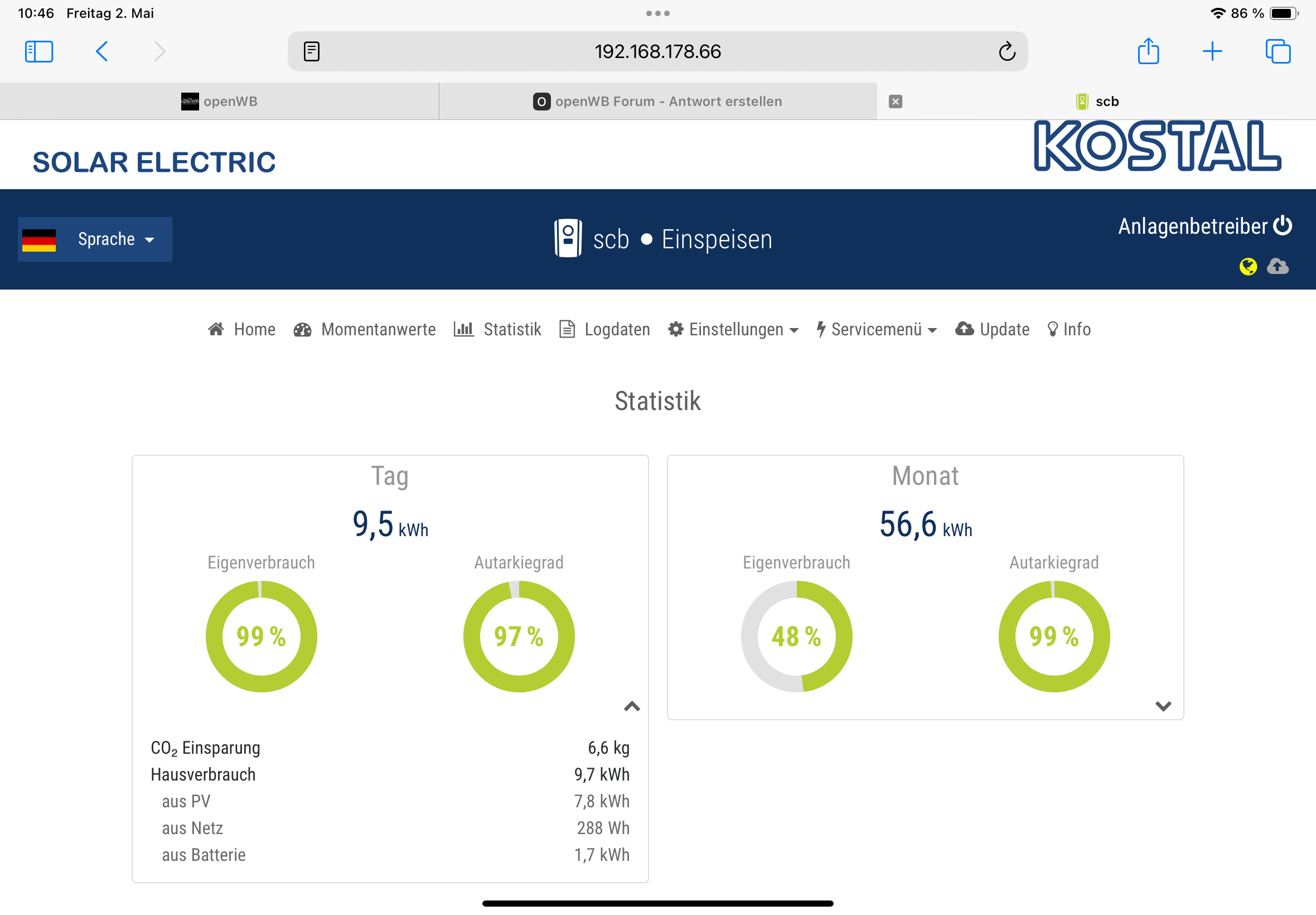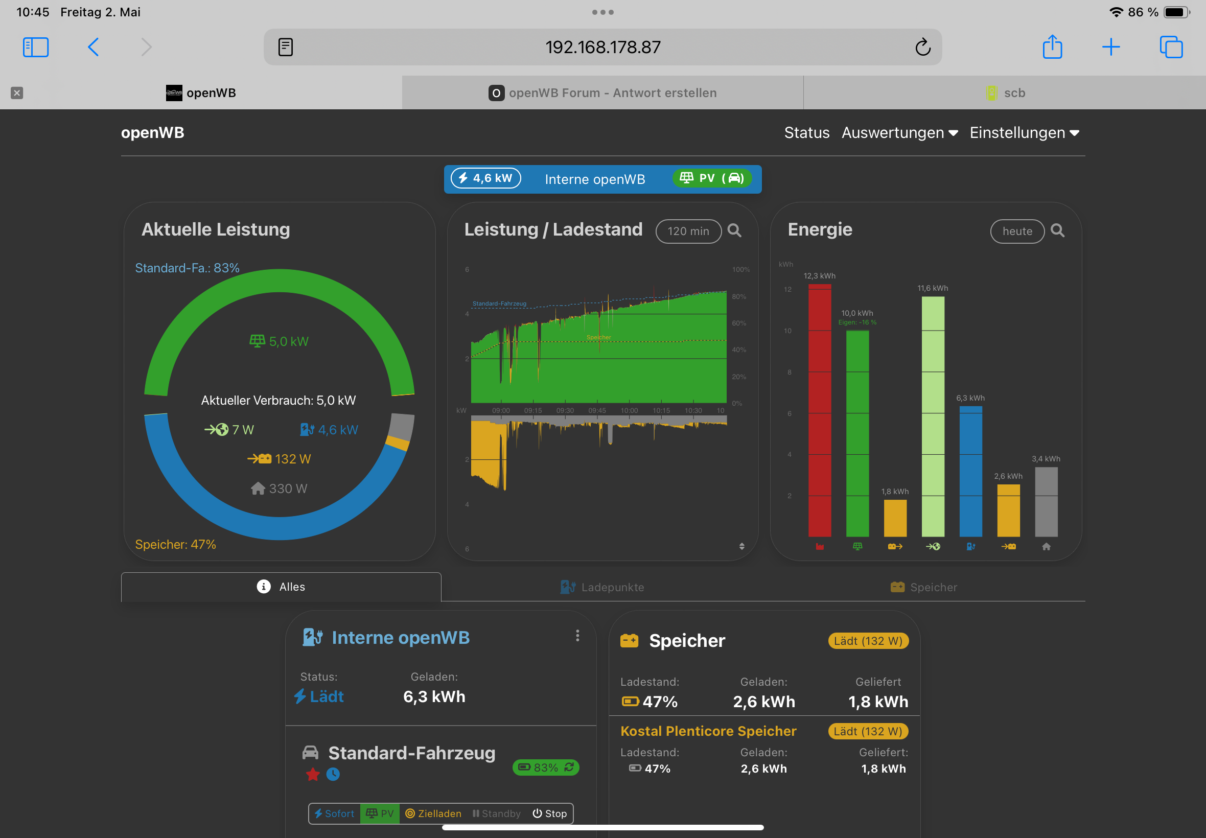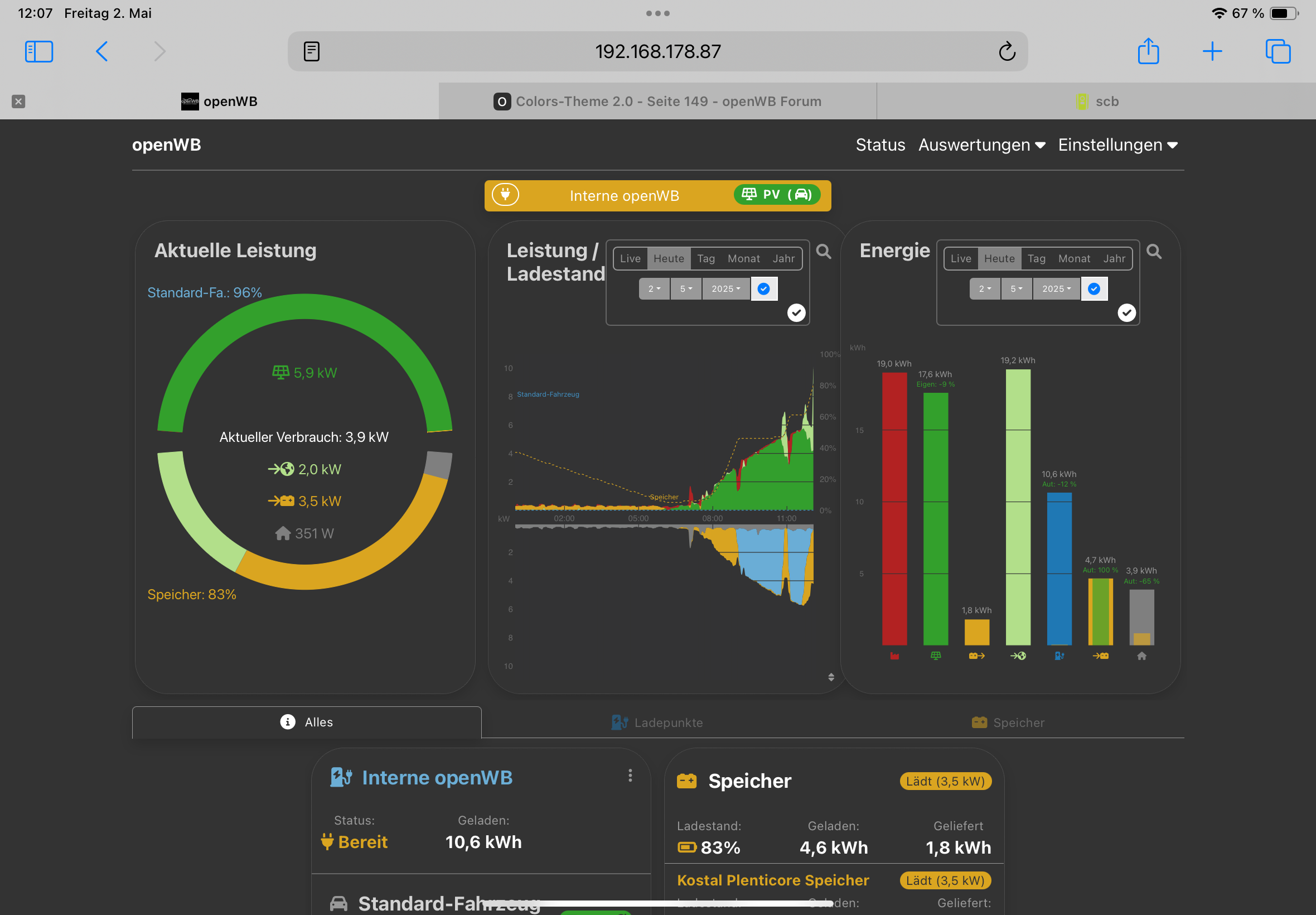 Ich habe 2 Ladepunkte die beide über eine openWB gesteuert werden. Insgesamt habe ich 3 Fahrzeuge, Audi und eGolf werden über Ladepunkt 1 geladen und die Profile vor dem Anstecken jeweils geändert. An Ladepunkt 2 wird ausschließlich eine Zoe geladen.electron hat geschrieben: Sa Apr 26, 2025 6:29 pm Ich habe das jetzt mal mit der letzten Master-Version ausprobiert - bei mir werden beide SOCs korrekt dargestellt.