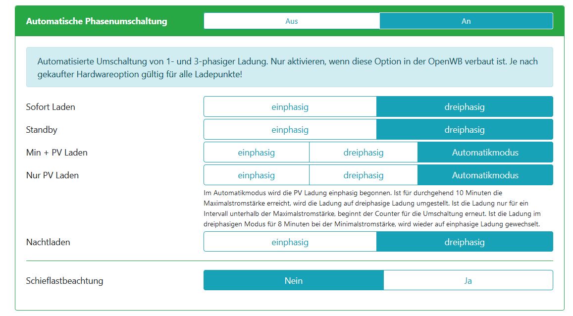 Ist die openWB mit Umschaltung errechnet sie automatisch ab wann geladen werden kann.