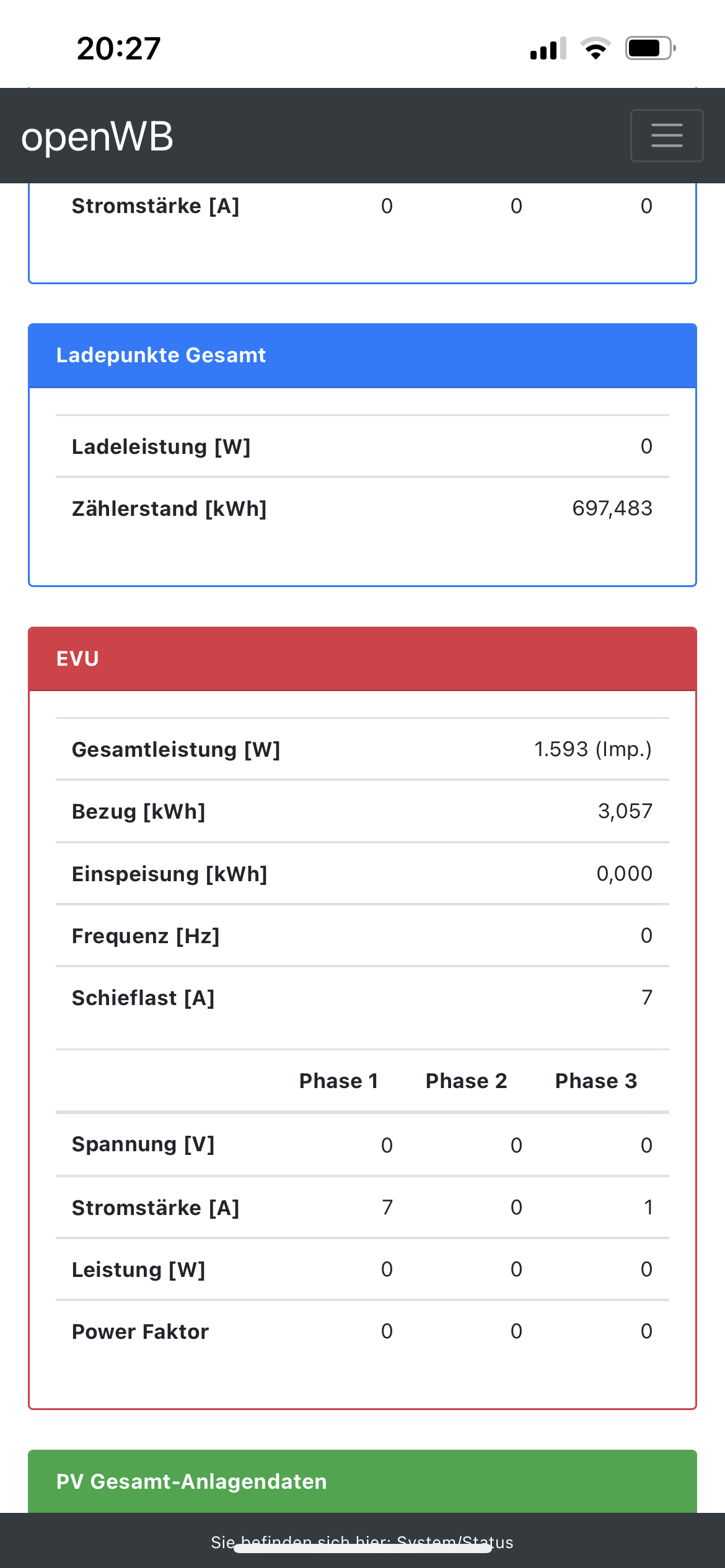 Okay, also im Status der OpenWB sind schon keine brauchbaren Daten vom Huawei Smart Sensor. OpenWB neu gestartet aber keine Besserung.