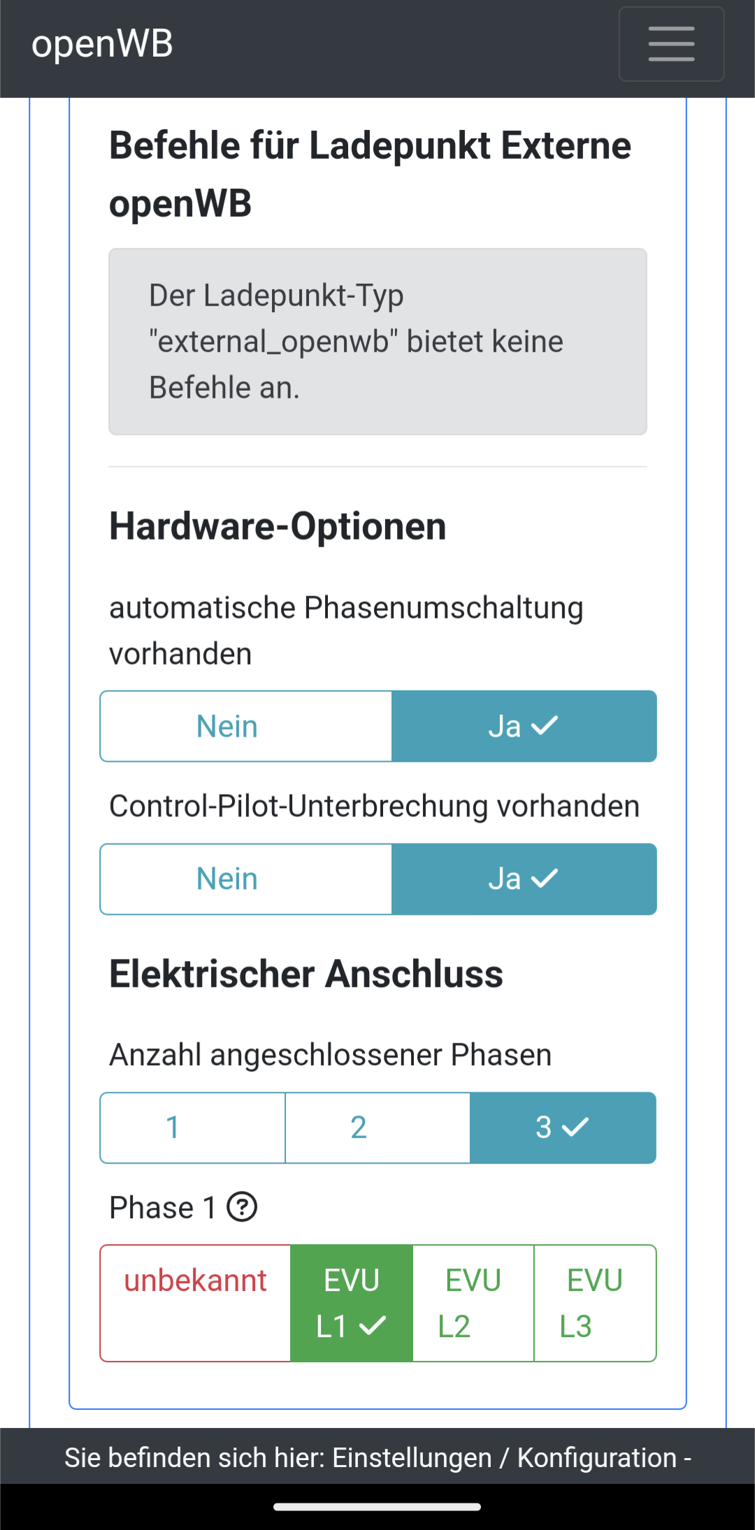 Nachdem ich dort fest auf "Maximum" gestellt habe, werden nun 3 Phasen vorgeschlagen (Im Status der externen openWB).