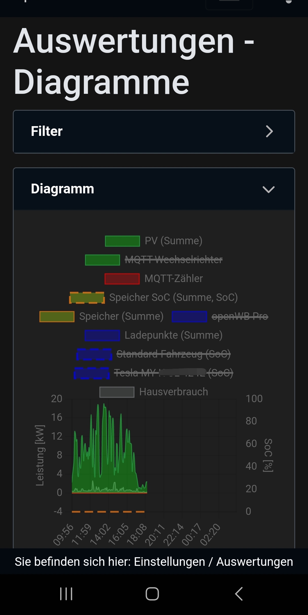 Also wenn ich mir die Grafiken so ansehe, dann ist das nicht entstanden während ein EV geladen wird. Die Formen sehen von der Form her gleich aus: PV und Zähler. Der MQTT-Zähler sollte in deiner Hierarchie der EVU-Zähler sein. Also das Anzeigen, was die PV-Anlage abgibt minus der Hausverbrauch. Eingespeiste Leistung ist negativ und bezogene Leistung aus dem Netz positiv.