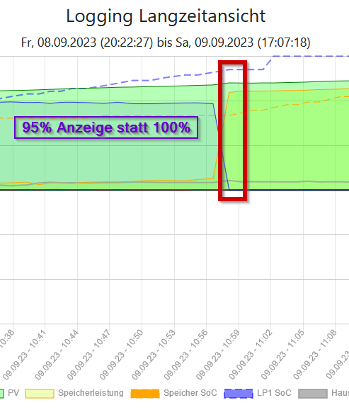 Heute Nacht hat sich der Ladestand gegen 0:35 wieder auf den Weg von vor der Ladung zurück gesetzt. Das ist natürlich ärgerlich, weil dann bei zunehmender PV-Leistung die Ladung neu startet bis das Fahrzeug bis 100% geladen ist. Hier besteht wohl noch der selbe Bug, der die Lademenge verändert.