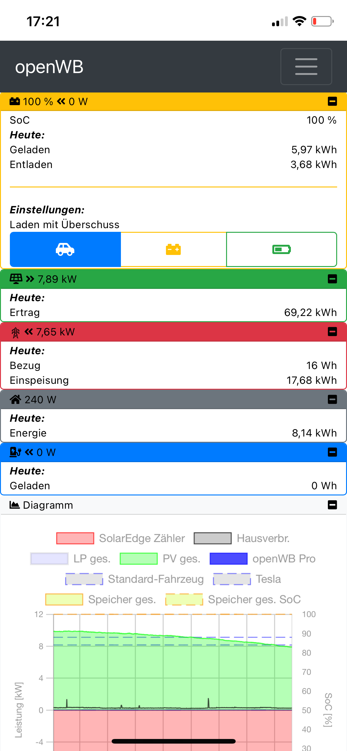 Hier mal ein Bild vom PV-Laden gegen Ende des Tages. Der zackelnde Hausverbrauch kommt von meinen smarthome-Heizlüftern. Prio war auf EV und es wurde passend abgeschaltet. Speicher ist auf 99%.