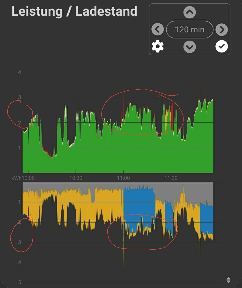 Kann das ggf. An meinem virtuellen Zähler den ich eingebaut habe zur Lastmanagement Steuerung der beiden Wallboxen liegen? Aber andererseits passt es ja in der 120min Ansicht...