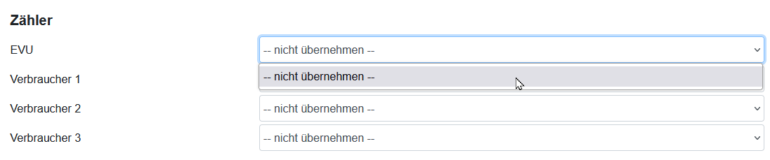 Wenn man einen Fronius Wechselrichter mit Fronius Smartmeter als EVU-Zähler konfiguriert, kann man bei der Datenübernahme diesen Zähler nicht bei Zähler/EVU auswählen.
