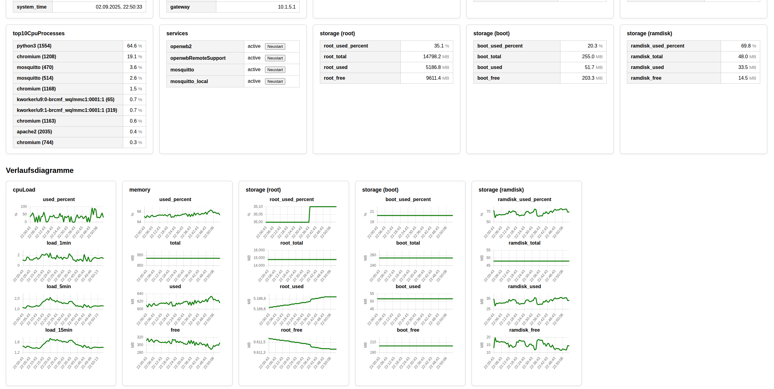 Ich habe heute Mittag die openWB neugestartet weil auf einmal (offenbar durch den Vorfall gestern) Geräte entfernt waren, bzw nicht mehr richtig ausgelesen wurden. Der memory used_percent lag nach dem Neustart bei ca. 50% (hab leider nen Screenshot vergessen) und ich hab seitdem die Maintenance Seite in nem Tab offen. Die used_percent sind jetzt in ca. 10h von 50% auf knapp 68% gestiegen, ist also anzunehmen das ohne Neustart, ohne Update irgendwann morgen Abend/Donnerstag Nacht der memory voll ist und dann wieder ein Nichterreichen zu verzeichnen ist.