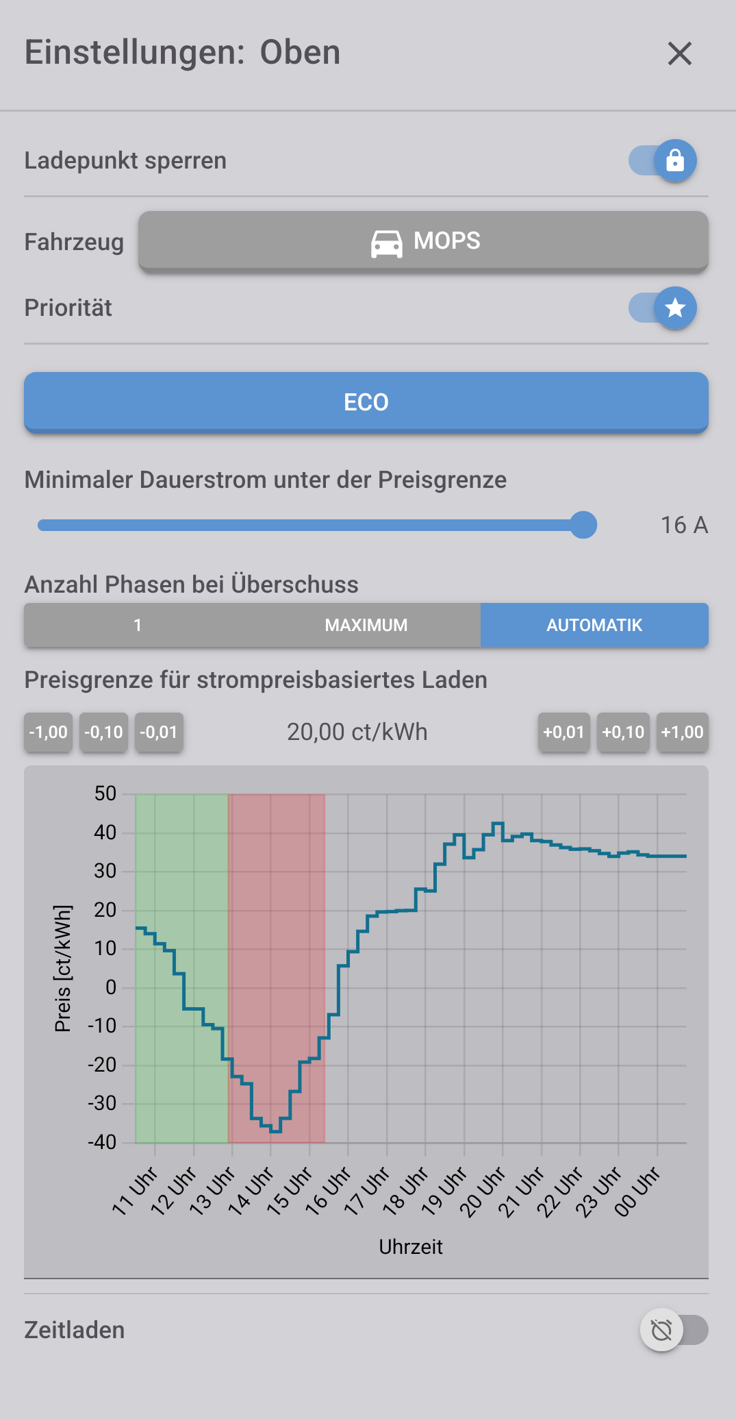 Zusätzlich zu dem schon geschilderten Problem, dass die Preiseinstellung bei 0ct verschwindet, noch ein weiterer Fehler bei der Preisdarstellung im koala Theme: Wenn der absolute Betrag eines negativen Strompreises die eingestellte Preisgrenze übersteigt, wird der entsprechende Zeitraum rot markiert (es wird nicht geladen). Hier im Screenshot ist der max. Preis auf 20ct gestellt, im Zeitraum wo der Preis kleiner -20ct war, wird laut Darstellung nicht geladen. Zusätzlich bleibt der Graph hinter dem betroffenen Bereich grau.