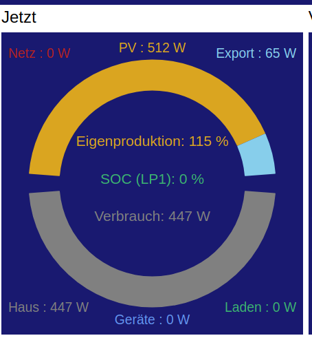 da stimme ich Dir natürlich vollkommen zu: solange die PV-Anlage produziert, sollte die WR-Leistung im oberen Teil gezeigt werden. Mein Screenshot ist allerdings von spätabends, wo der WR eine negative Leistung (Standby-Verbrauch) hat. In dem Moment ist der WR ja ein Verbraucher und gehört somit eher in den unteren Teil des Diagramms.