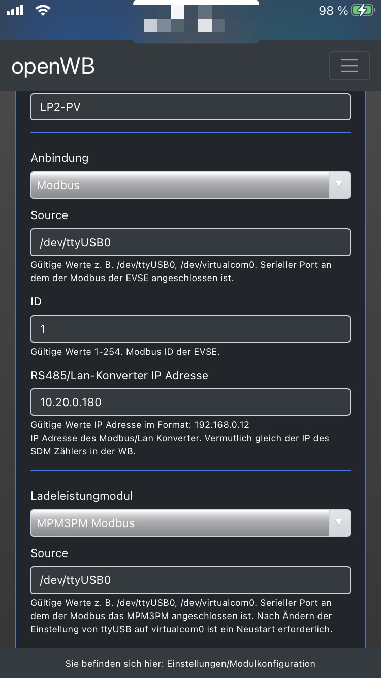 openWB Series 1/2 Duo muss jedoch auf Modus mit USB0 und ID 106 gestellt werden gemäß ersten Bild. Danke an den Support.