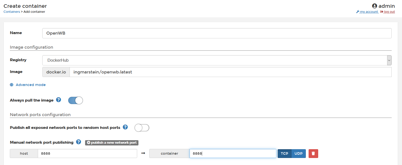 docker run --network host -d -e WEB_PORT=8888 --cap-add=NET_ADMIN -v /openwb.conf:/var/www/html/openWB/openwb.conf ingmarstein/openwb