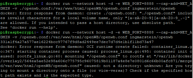 docker: Error response from daemon: OCI runtime create failed: container_linux.go:367: starting container process caused: process_linux.go:495: container init caused: rootfs_linux.go:60: mounting "/openwb.conf" to rootfs at "/var/lib/docker/overlay2/d1127a93bfc4bc60b3051f51992ca5684dbb9245e2dc38b8bf0a6aeaefd70c80/merged/var/www/html/openWB/openwb.conf" caused: not a directory: unknown: Are you trying to mount a directory onto a file (or vice-versa)? Check if the specified host path exists and is the expected type.