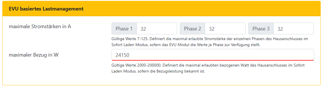 EVU basiertes Lastmanagement: Überwacht den Hausanschluss um eine maximal eingestellte Gesamtleistung (kW) und Stromstärke pro Phase (A) nicht zu überschreiten. Z.b. durch andere parallele große Verbraucher.