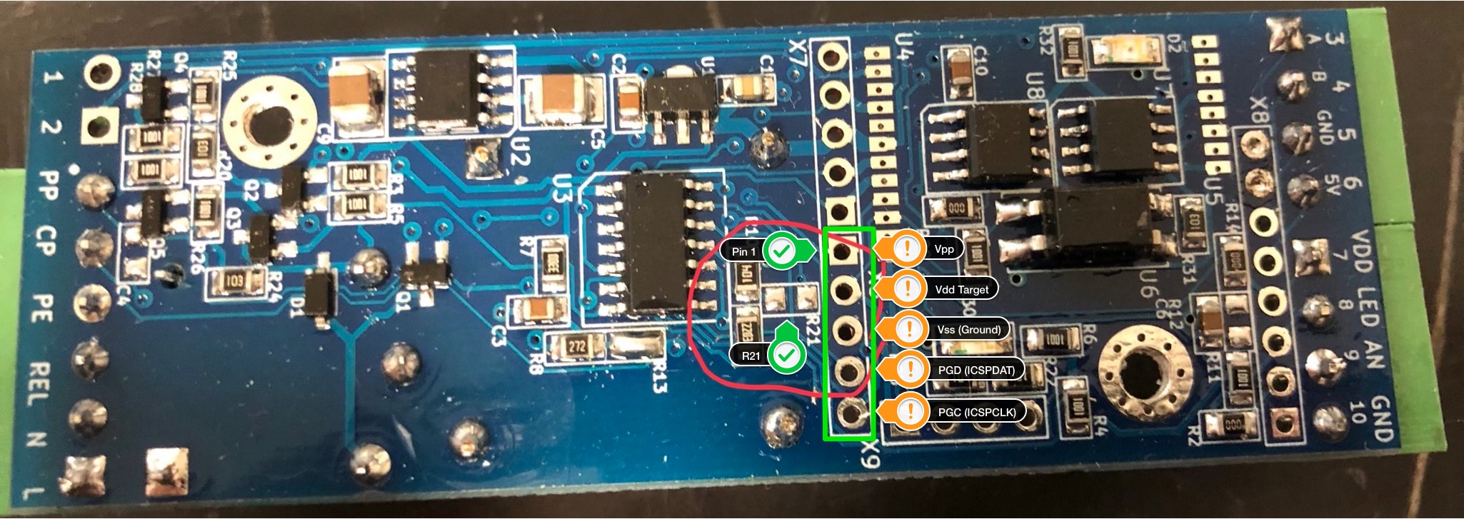 Hab heute meine EVSE DIN erfolgreich mit R21 belötet und die Firmware Revision 11 aufgespielt. Dank der guten Anleitung hier hat alles geklappt. Zuerst musste ich aber erst noch eine sinnvolle Kombination des 6-poligen Steckers aus dem PICkit mit den 10 Anschlüssen auf der EVSE DIN finden. Das Geheimnis ist, Pin 6 vom PICkit wird nicht benötigt und die übrigen Pins gehen auf die 5 Pins die auf der EVSE mit Prog bezeichnet sind. Pin 1 sitzt in der Mitte der Platine (quadratisches Lötauge), am PICkit ist Pin 1 mit einem Dreieck gekennzeichnet. Hab mir der Einfachheit halber gleich eine Pfostenleiste auf der EVSE eingelötet ...
