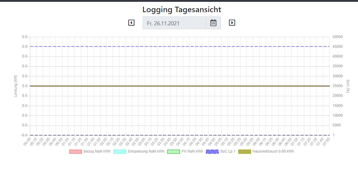 nun hat sich zumindest in der Logging-Tagesansicht die Legende geändert. Nun passen zumindest die Beschreibungen: Der SoC liegt bei sagenhaften 45000%. Irgendwie habe ich also die Physik überlistet