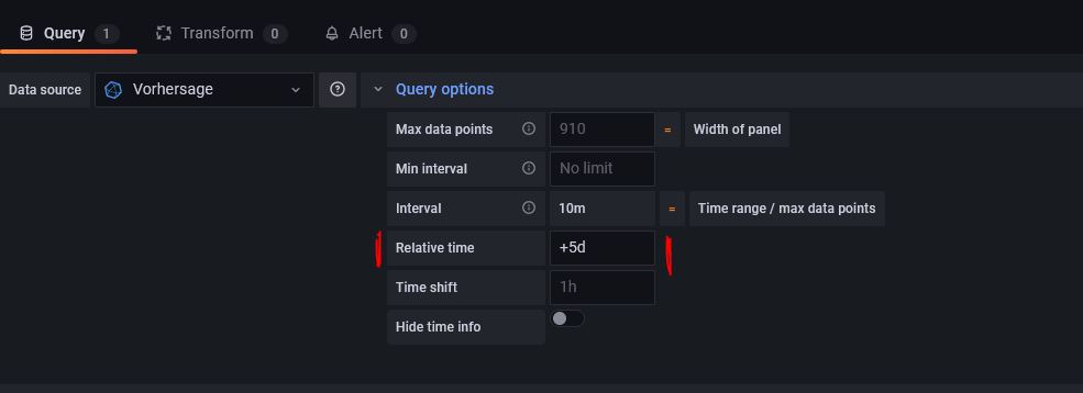 Genau, ansonsten kannst du ganz normal in Grafana deine InfluxDB anzapfen und dir die Werte anzeigen lassen. Ggf musst du nur den Zeitraum über die "Query Options anpassen" indem du dem ganzen ein "+" vorstellst um in die Zukunft zu gehen: