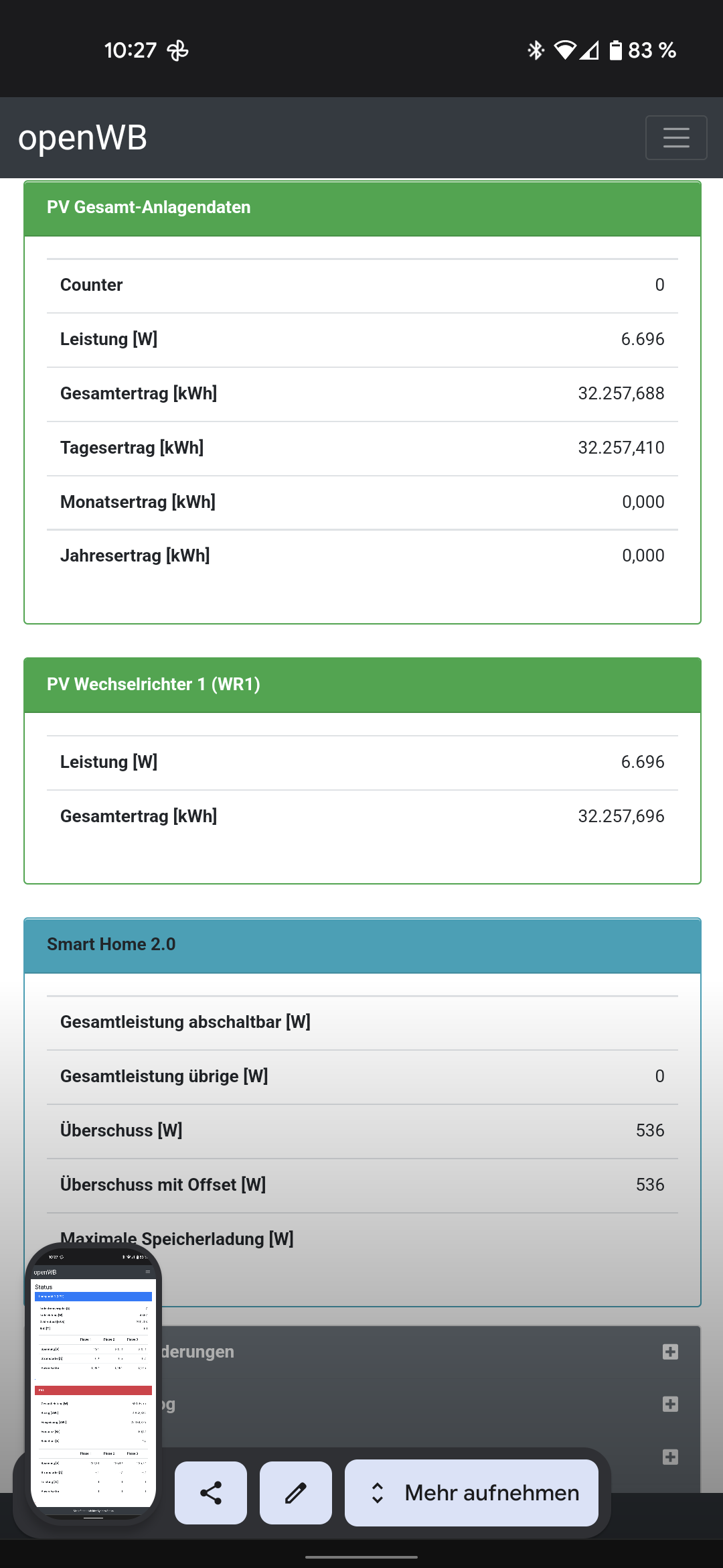 Anmerkung zu vorherigem Post: erst bei 4,2kW PV Leistung schnallt die OpenWB 2 dass sie mit dem Laden beginnen kann. Selbst wenn auf Einphasig gestellt. Da bleibt sie dann logischerweise im Maximum hängen.
