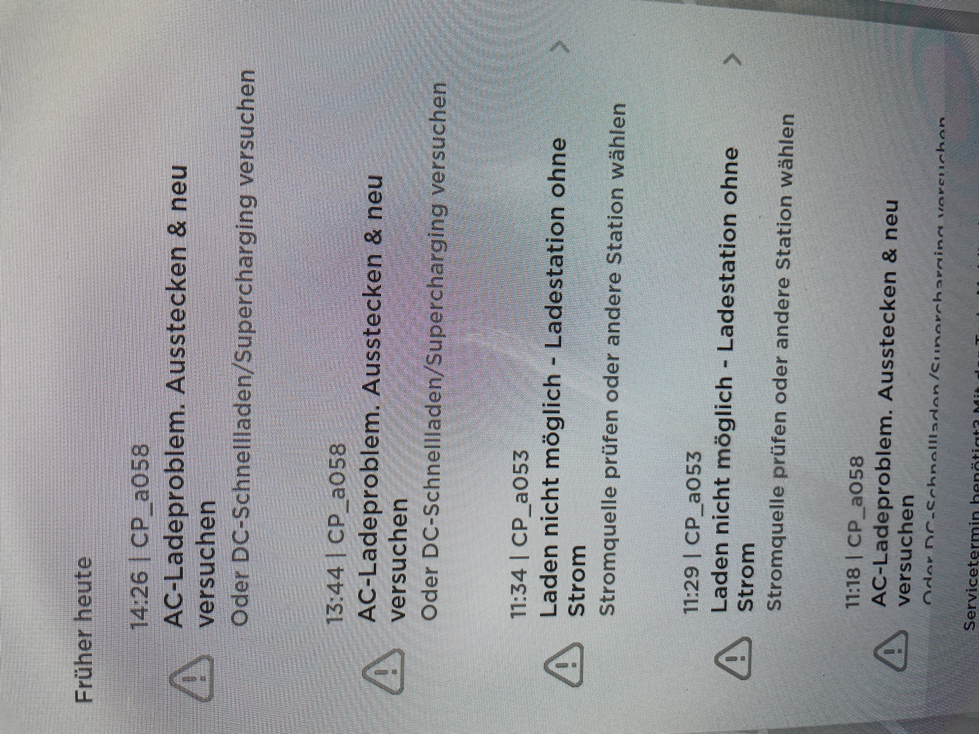 Dabei gab es zwei Fehlermeldungen: einmal die erwartete, normale CP_a055 "kommunikation mit Laseausrüstung abgebrochen" - oder einfach, "gib mir meinen Strom wieder...." und die problematische CP_a058 "AC-Ladeproblem Ausstecken und neu versuchen"