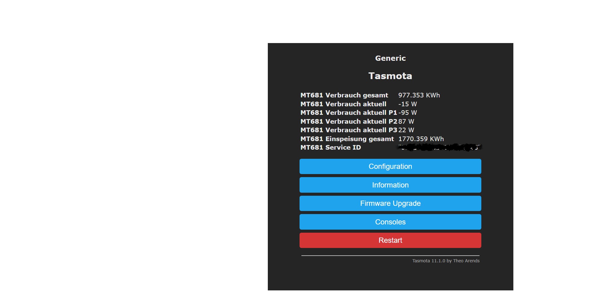{"StatusSNS":{"Time":"2022-10-05T17:40:24","EM":{"Total_in":983.513,"Power_curr":-14,"Power_p1":1195,"Power_p2":-413,"Power_p3":-798,"Total_out":1771.141,"Meter_id":"XXXXXXXXXXXXXXXXXXXX"}}}