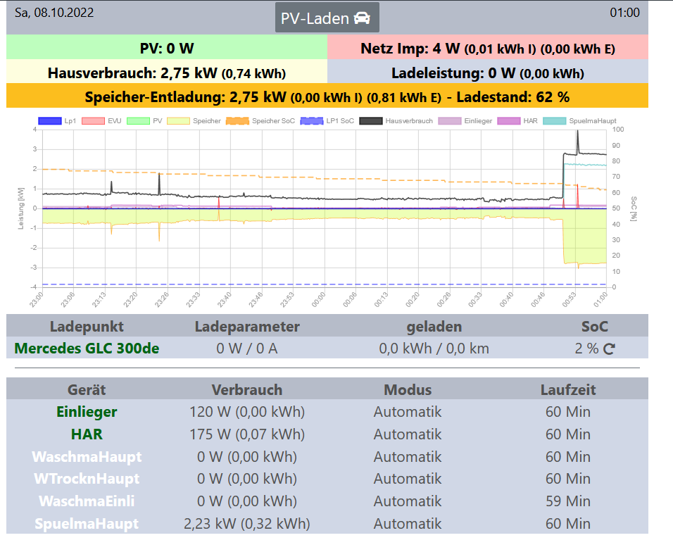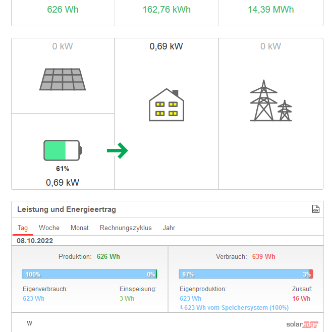 PV (Energie) wird nachts nicht mehr angezeigt, der Hausenergie passt auch; einzig die abgegebene Speicherenergie scheint ein wenig zu hoch.( zu vernachlässigen!? )
