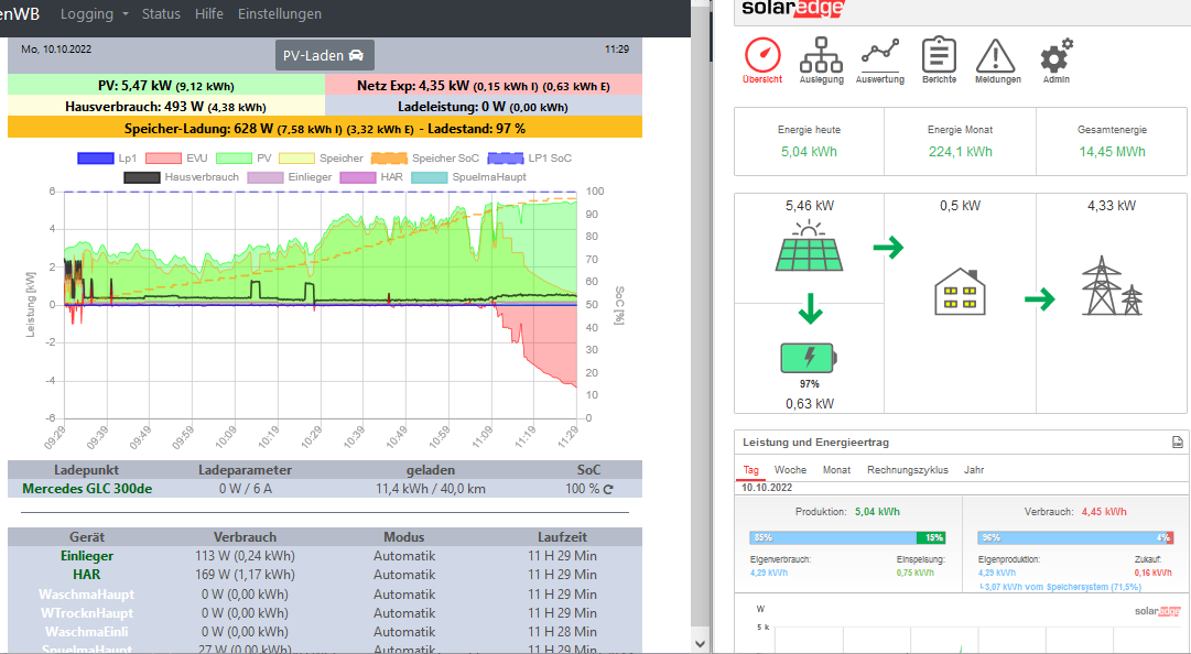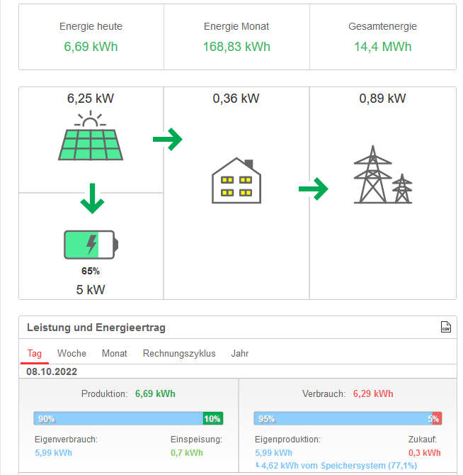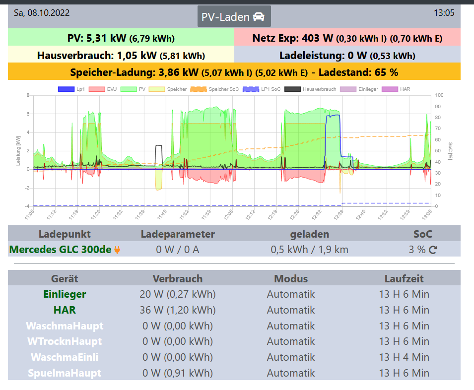 Ja, auch ich fand die frühere Berechnung besser.Elchkopp hat geschrieben: Sa Okt 08, 2022 7:30 am Ehrlich gesagt fand ich es bisher eigentlich ganz gut, dass die OpenWB bei "PV" die (vermeintlich) tatsächlich auf dem Dach erzeugte Tagessumme der kWh angezeigt hat und eben nicht das, was in den Speicher geflossen ist (Speicher-Ladung "I" in der OpenWB), nicht zur Tagesproduktion dazugezählt hat - so wie Solar Edge das macht. Ich finde es halt interessant zu sehen, was wirklich "auf dem Dach" erzeugt wurde - unabhängig davon, ob es Verbraucht, in den Speicher oder ins Netz geflossen ist.