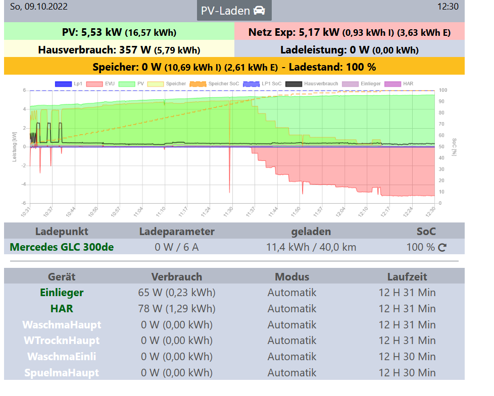Einen Unterschied zu den vorherigen Beispielen sehe ich darin, dass nun viel Energie zum EVU exportiert wird und der Speicher voll ist.