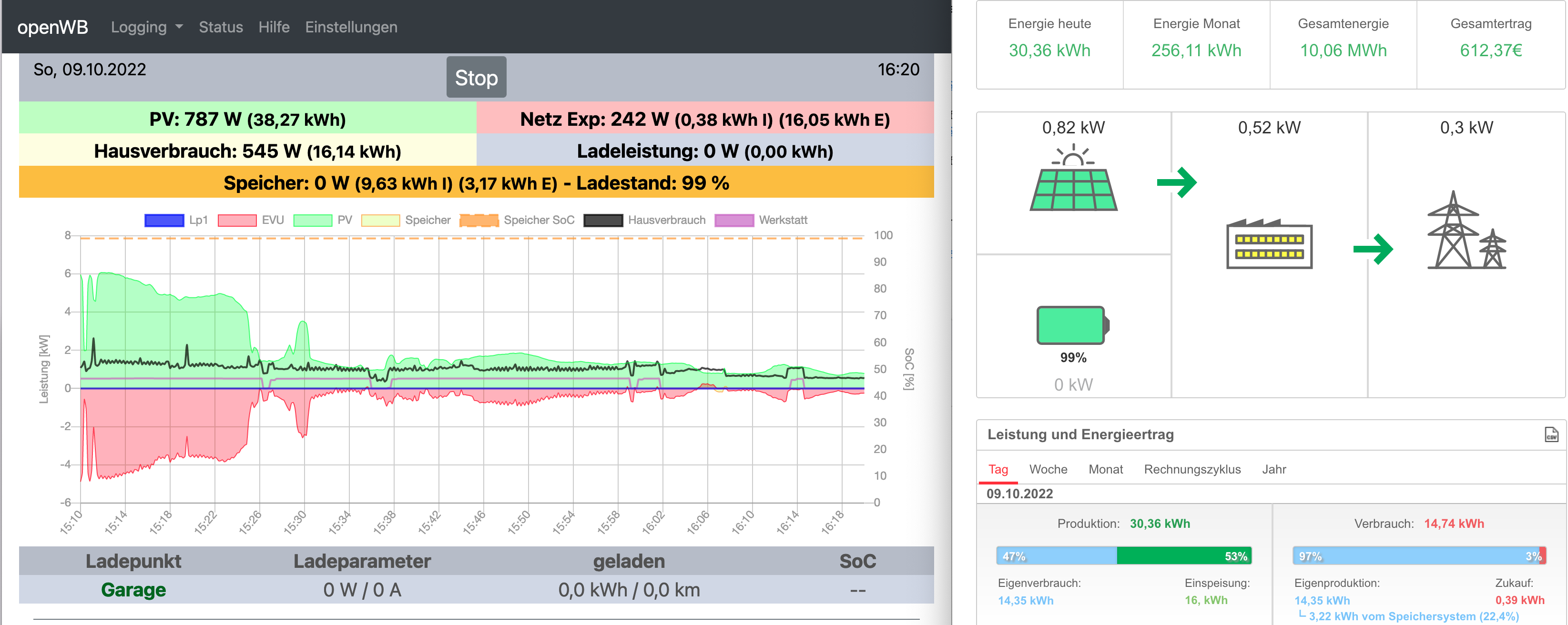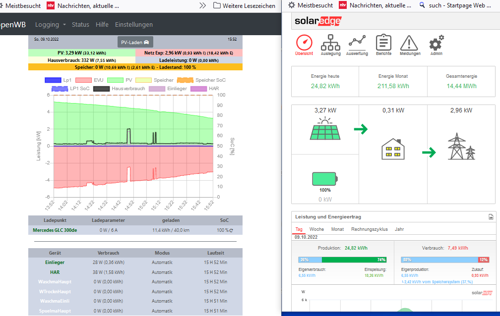 Auch heute, wo der Speicher noch nicht voll geladen ist, ist openWB PV > SE Produktion.