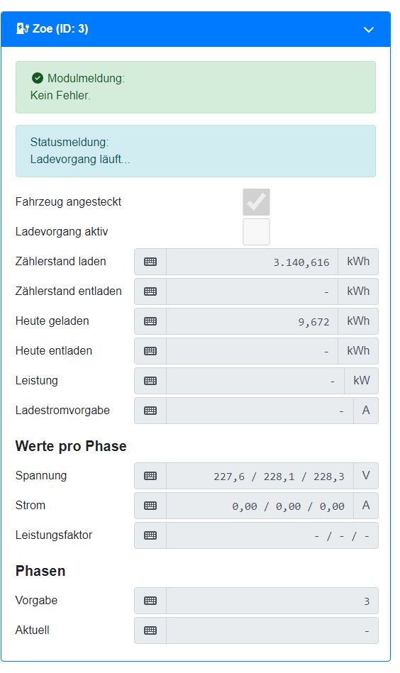 {'set': {'reserved_surplus': 0, 'released_surplus': 0, 'raw_power_left': None, 'surplus_power_left': 0, 'raw_currents_left': [15.0, 15.0, 15.0]}, 'get': {'daily_exported': 0.0, 'daily_imported': 0.0, 'fault_str': 'Kein Fehler.', 'fault_state': 0, 'voltages': [230.0, 230.0, 230.0], 'currents': [0.0, 0.0, 0.0], 'powers': [0.0, 0.0, 0.0], 'power_factors': [0.0, 0.0, 0.0], 'imported': 108158.61628581406, 'power': 0.0, 'frequency': 50, 'exported': 0.0}, 'config': {'max_currents': [16, 16, 16], 'max_total_power': 11000}}