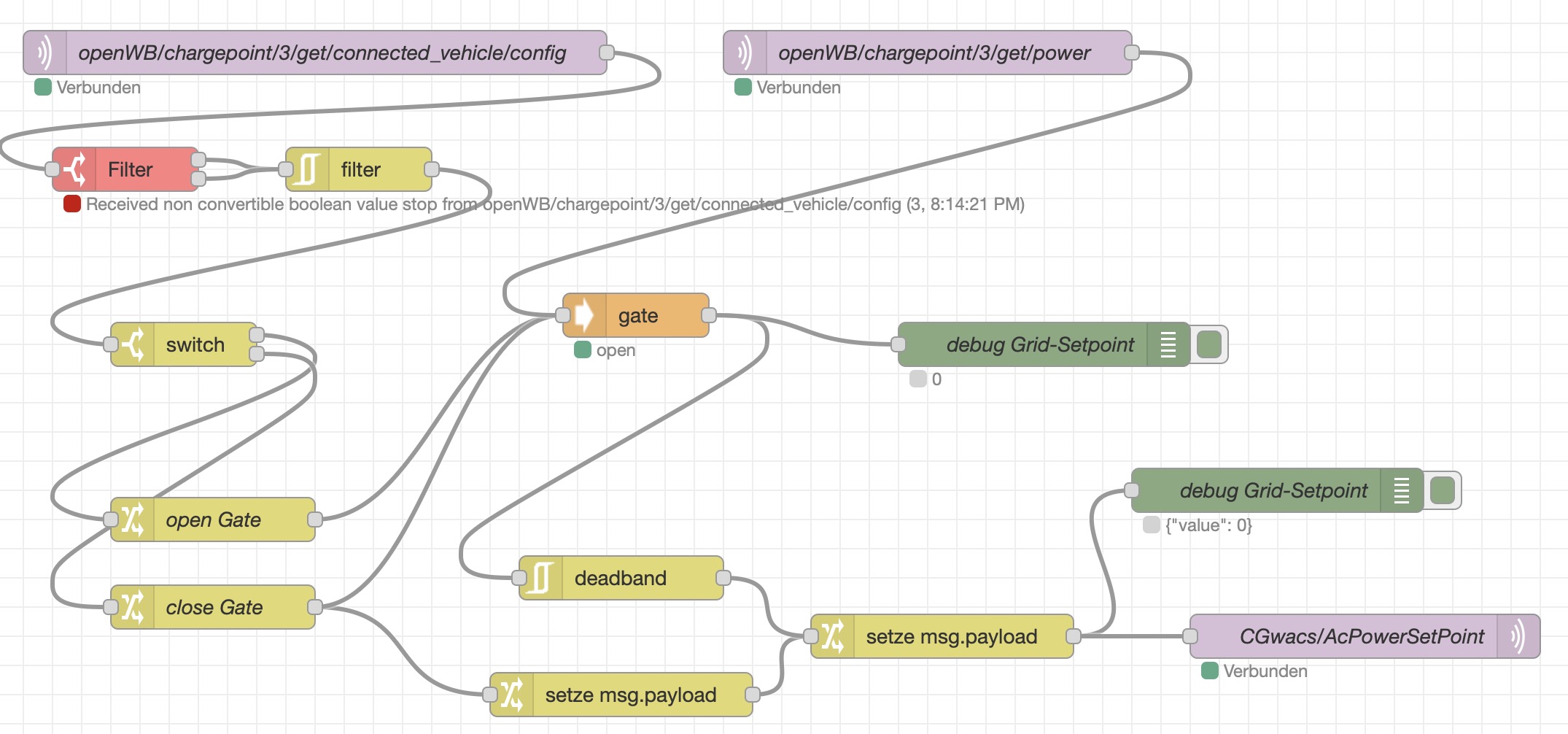 Man sieht aber, dass der Filter-Node ganz oben links einen Fehler produziert, weil der Message/payload "stop" von openWB nicht interpretieren kann.