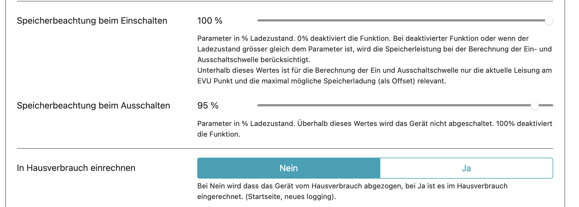 Laut der Grafik in der "Auswertung" ist der HAUS-SOC bei rund 91% zu dem Zeitpunkt wo er einschaltet. Man kann nämlich beim PV-Laden des BEV nur einstellen, das er bei "über 95%" noch mit laden anfängt bis runter zu einem SOC von 90%. Warum er zum Auto-Laden meine Hausbatterie unbedingt entladen muss, ist mir auch noch ein Rätsel, das will ich eigentlich anders als man es einstellen kann. Aber das scheint dummerweise eben auch nicht zu funktionieren, die OpenWB entlädt mir die Haus-Batterie auf 91%, schaltet dann das PV-Laden aus (so ca. 16:55) und daraufhin schaltet der Heizstab (fälschlicherweise) noch ein.